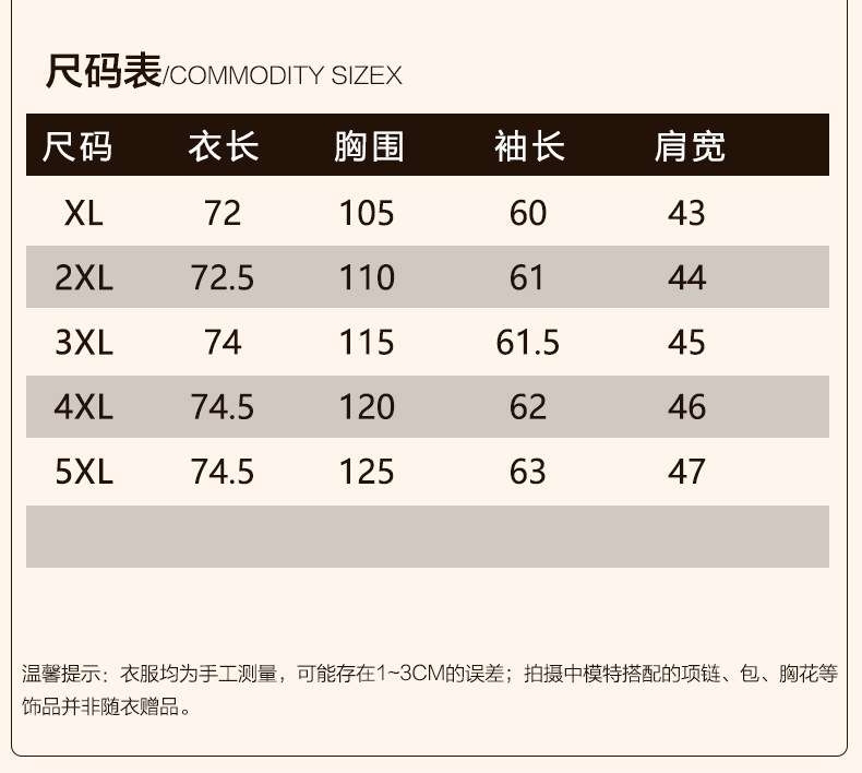 尺码 XL (推荐105斤以下),2XL (推荐105-120斤),3XL (推荐120-135斤),4XL (推荐135-150斤),5XL (推荐150-170斤)