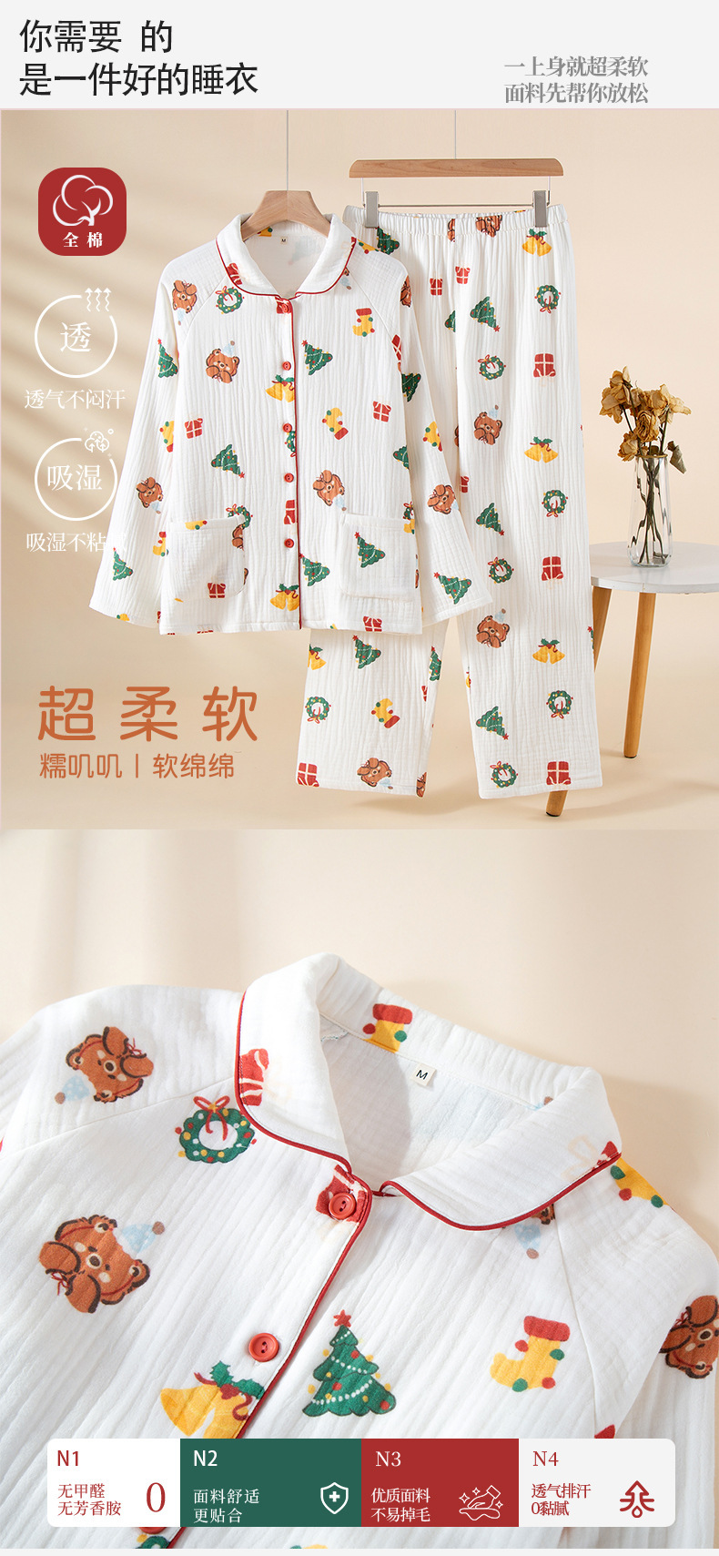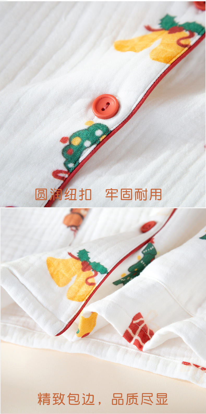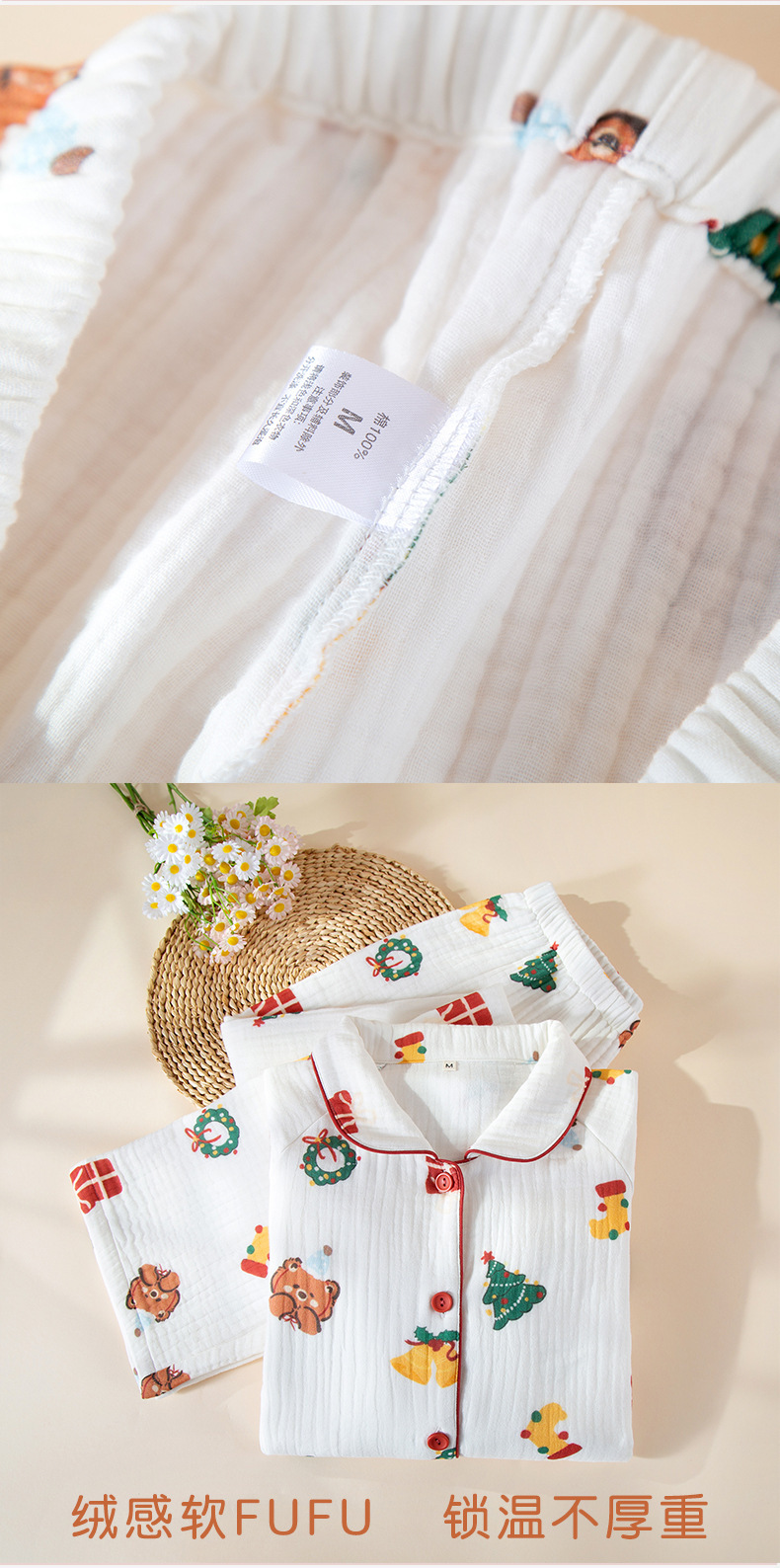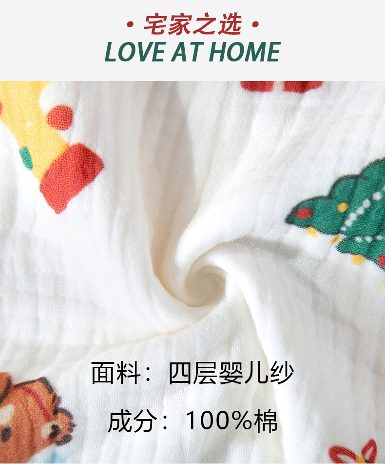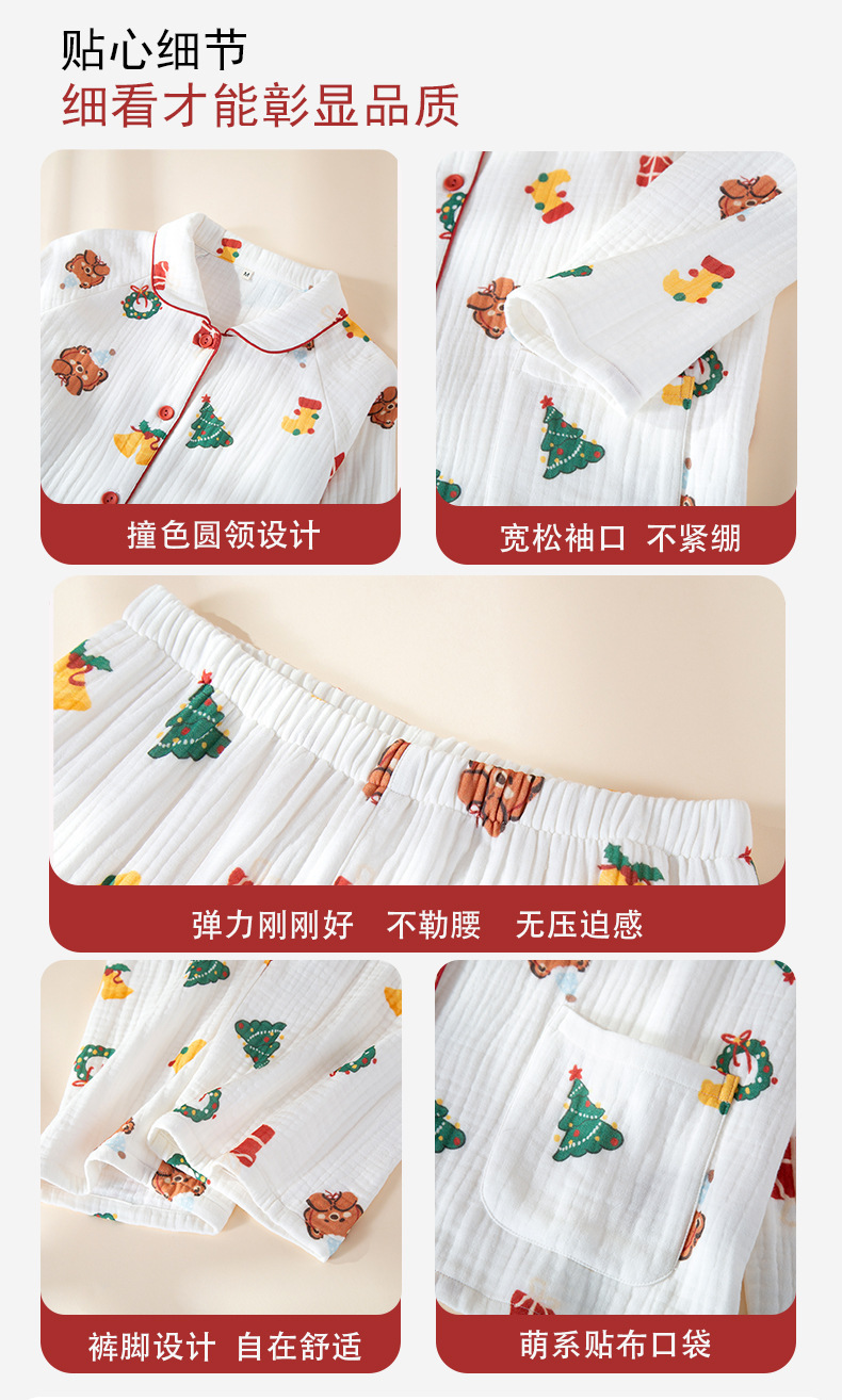 纯棉四层婴儿纱睡衣女秋冬季新款卡通风圣诞小熊家居服可批发代发