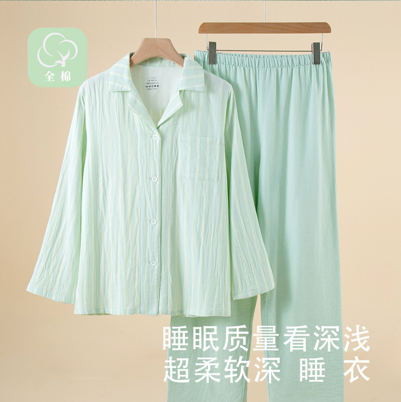 纯棉色织纱布睡衣女春秋款无印风AB版长袖长裤家居服套装可外穿