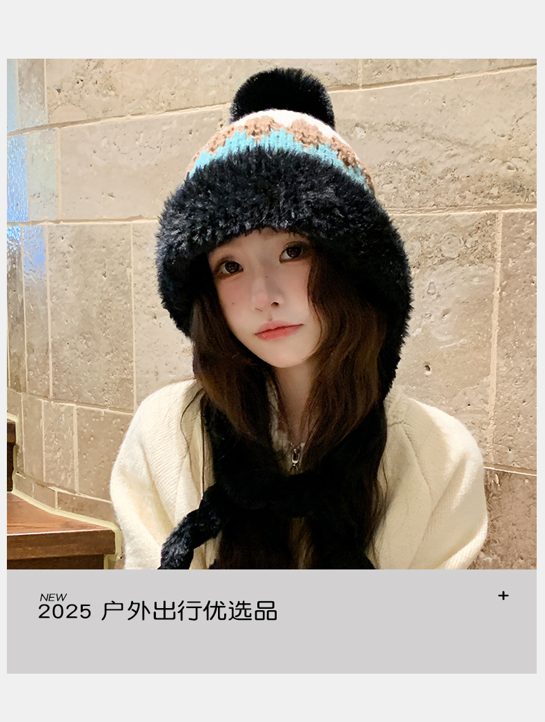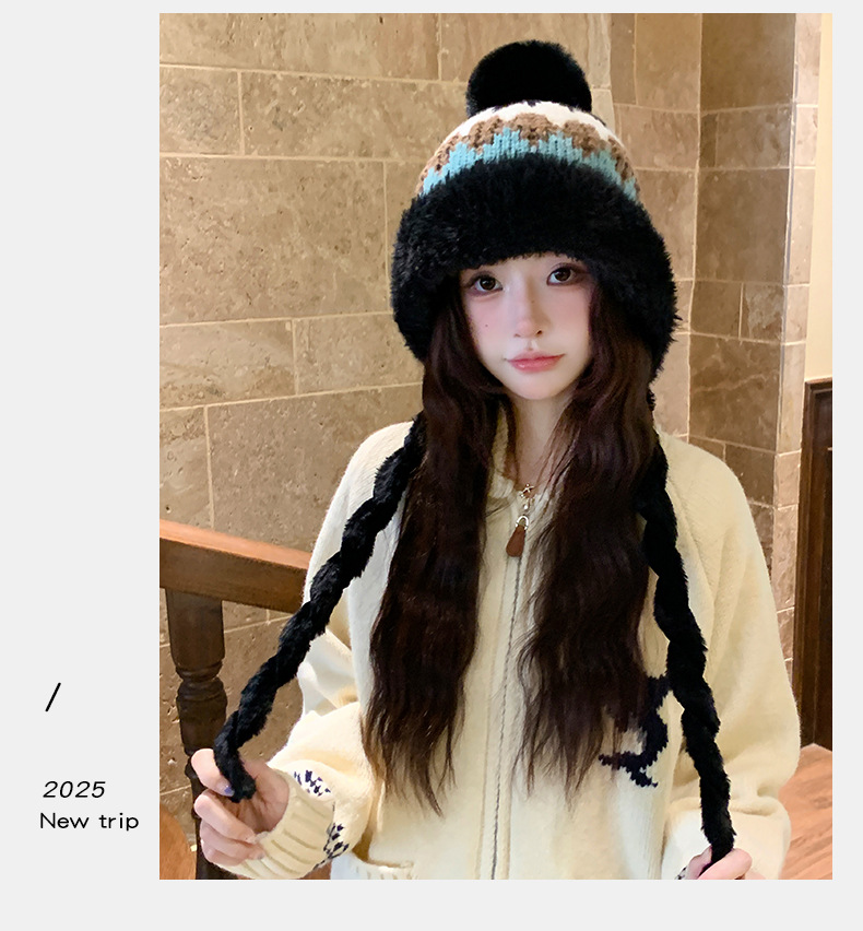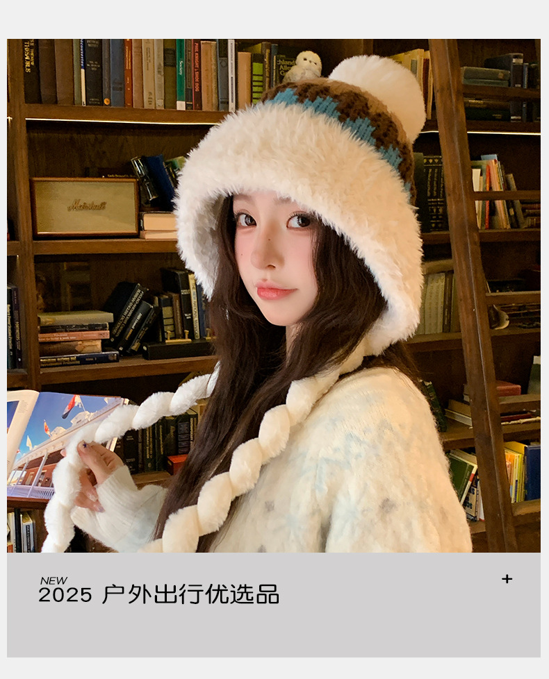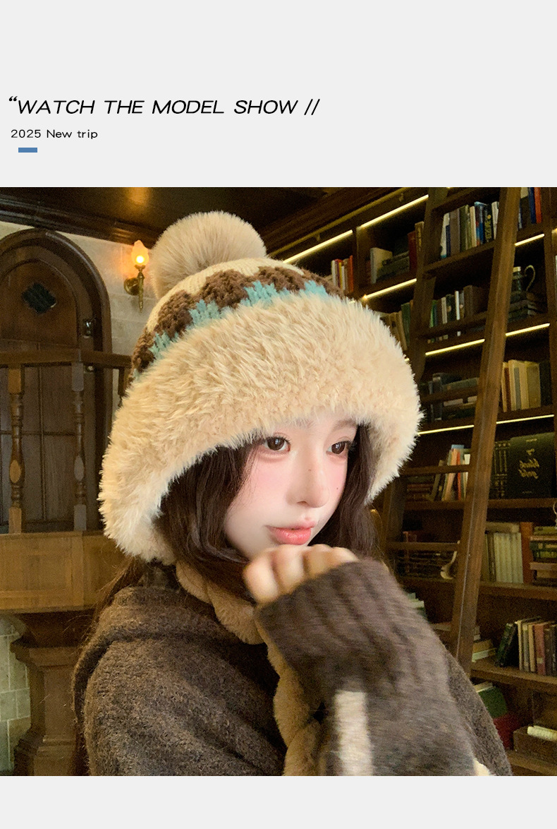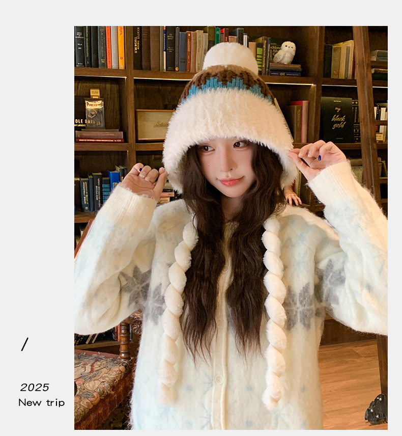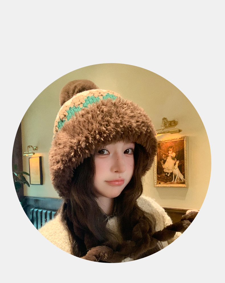 2025新款费尔岛风毛球针织帽子女冬季加厚保暖毛线帽显脸小雷锋帽