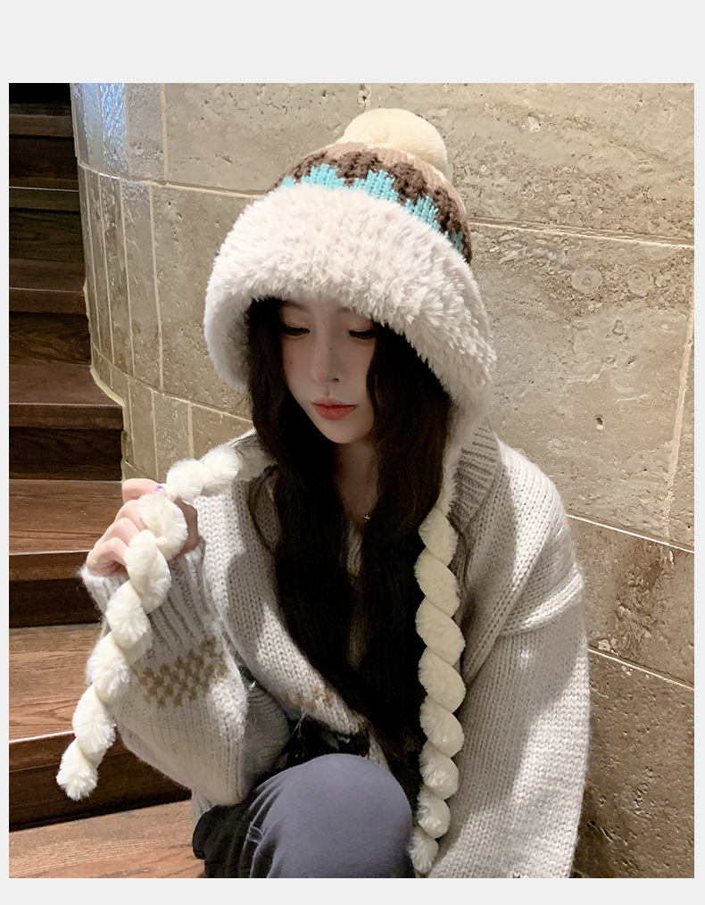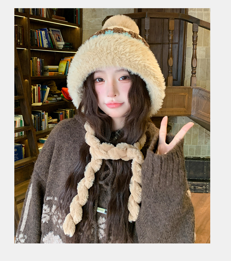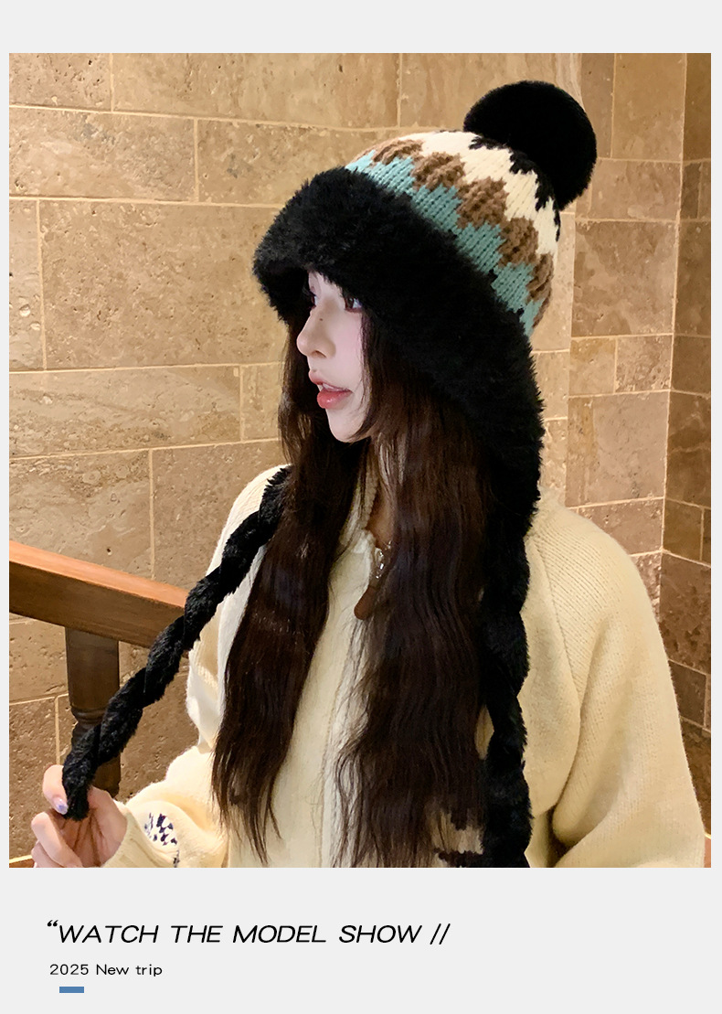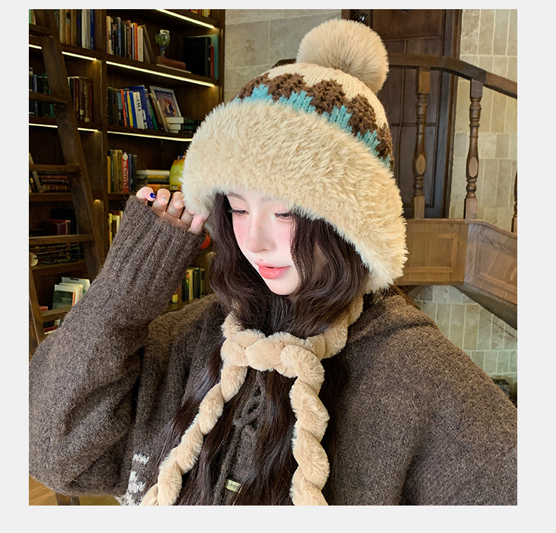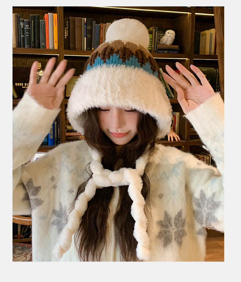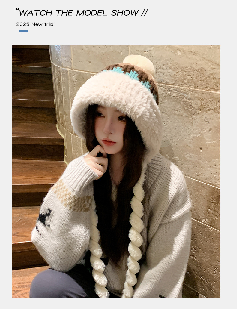 2025新款费尔岛风毛球针织帽子女冬季加厚保暖毛线帽显脸小雷锋帽