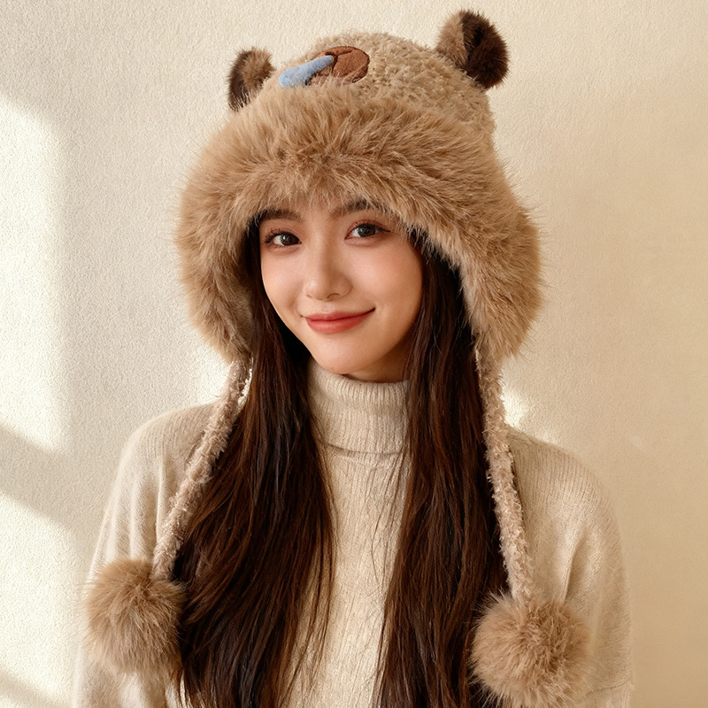 卡皮巴拉毛绒雷锋帽子女秋冬新款加厚保暖针织帽护耳显脸小套头帽