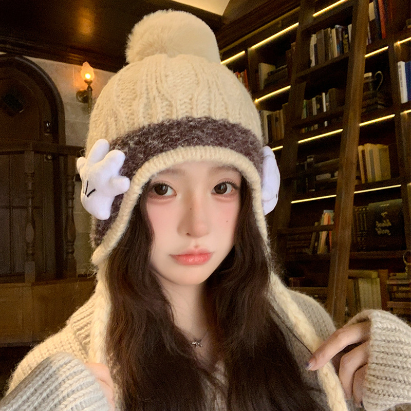 甘いかわいい秋冬帽の子供韓国版百合学生ニット帽屋外保温フード耳保護ウール帽