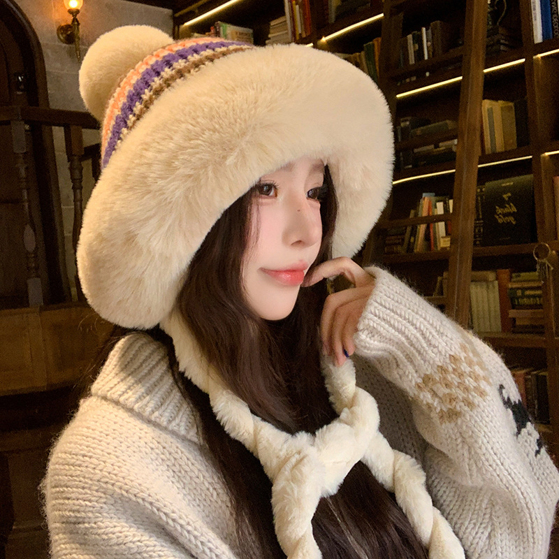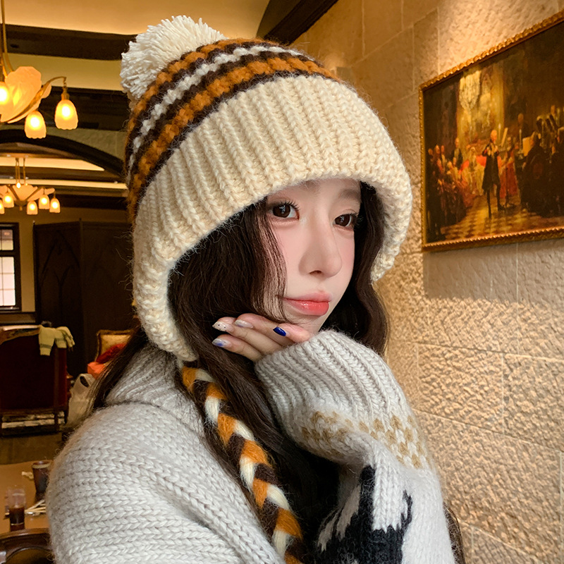 秋冬复古条纹毛球帽子女加厚保暖护耳毛线帽大头围显脸小针织帽潮