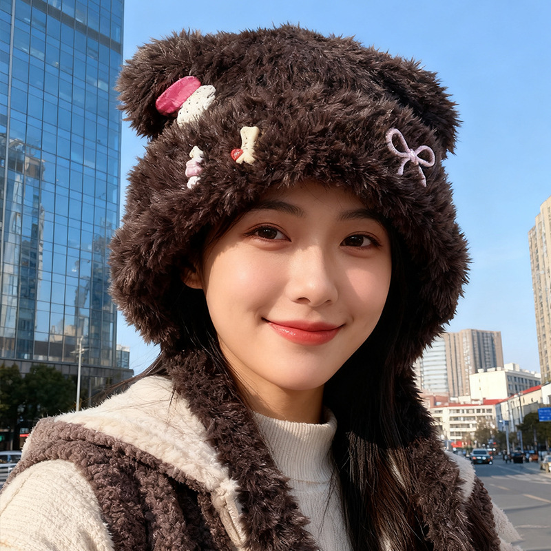 可爱小熊耳朵蝴蝶结毛绒帽子女秋冬保暖护耳雷锋帽显脸小针织帽子