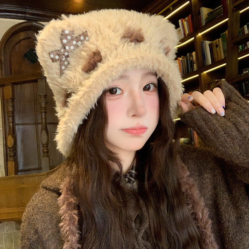 蝴蝶结帽子女秋冬2025新款可爱保暖毛绒帽护耳显脸小针织帽潮