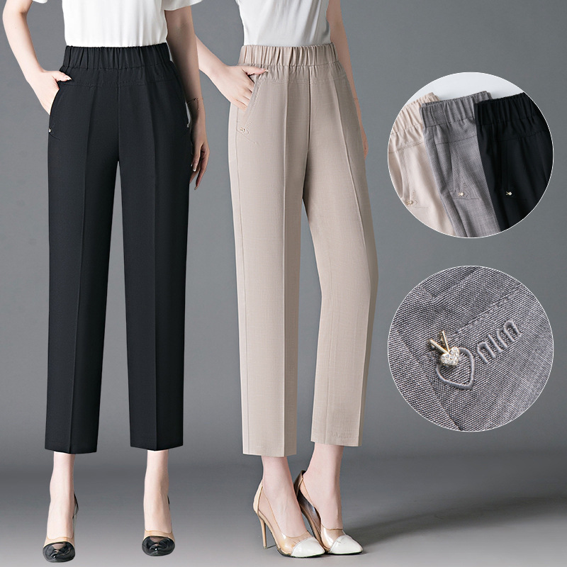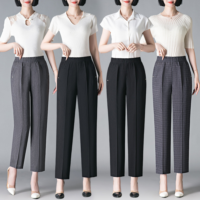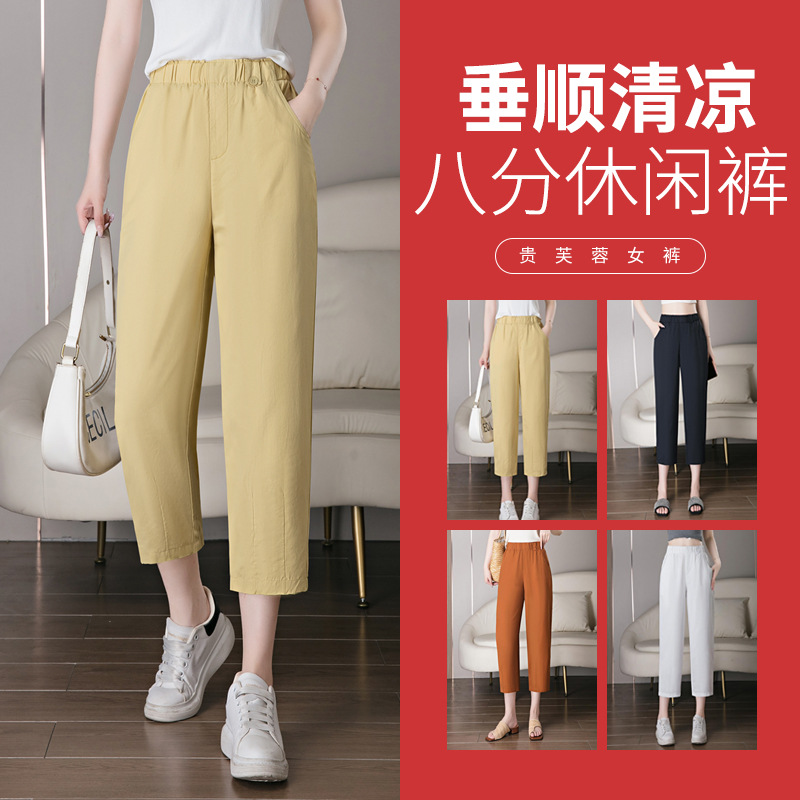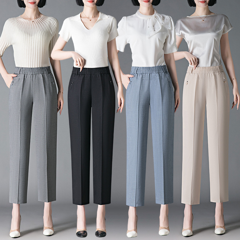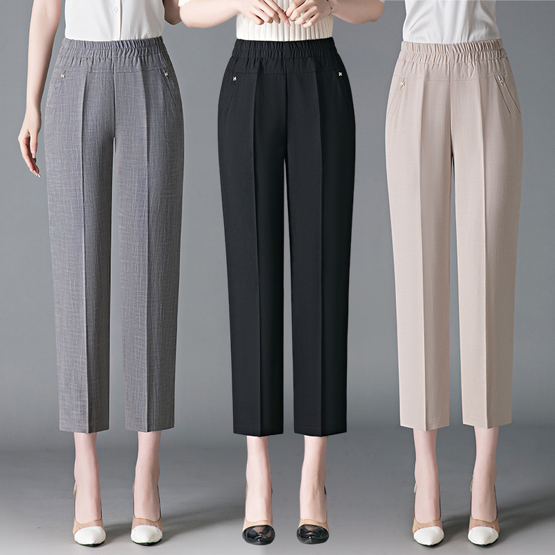 夏用の薄手で通気性の良いドレープ9点パンツ、中高年ママ向けのゆったりストレートハイウエストカジュアルパンツ