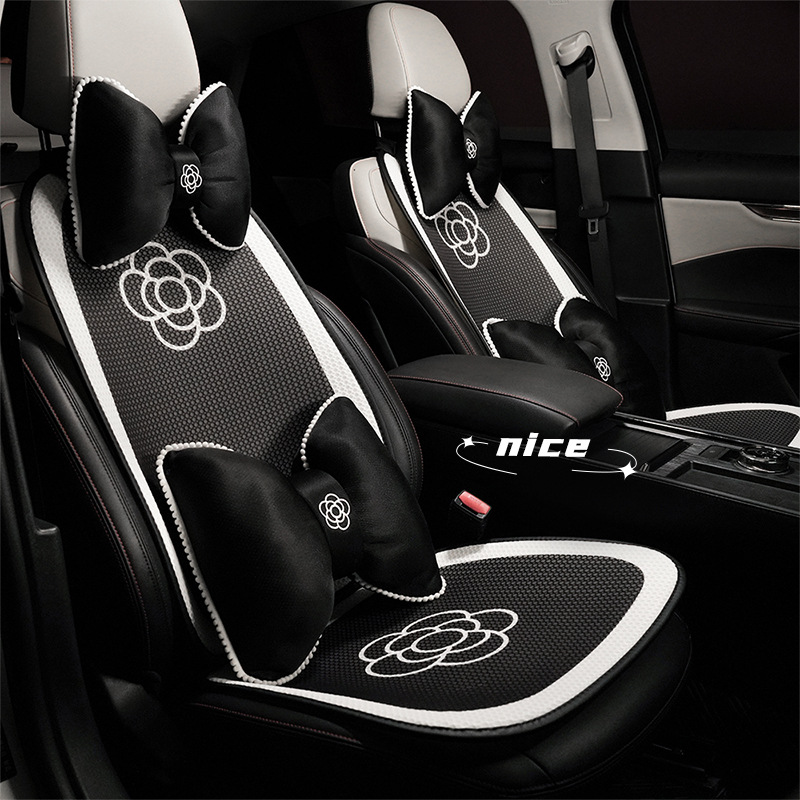 四季通用椿の花のリボン付き車用ヘッドレスト&腰痛サポート、アイスシルクの快適で柔らかい車載枕、ネックピロー