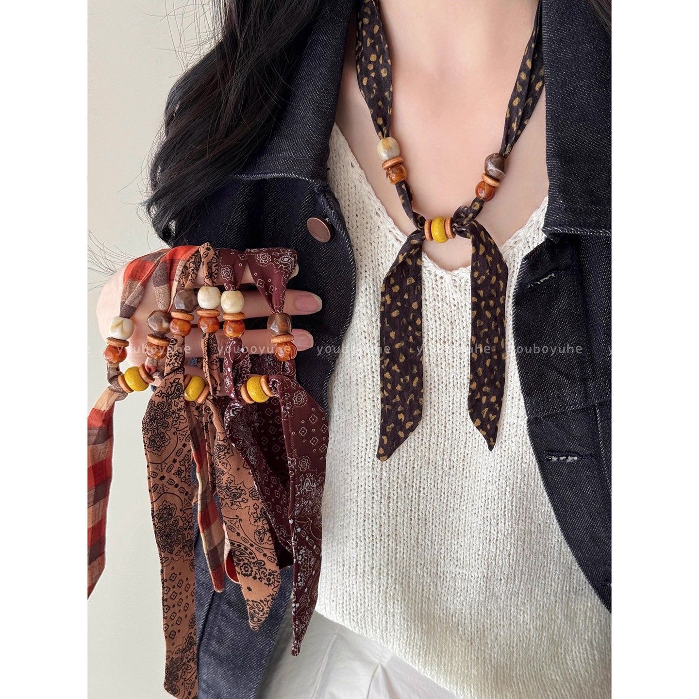 复古咖色腰果花串珠丝巾项链女设计感小众独特毛衣链日常百搭配饰