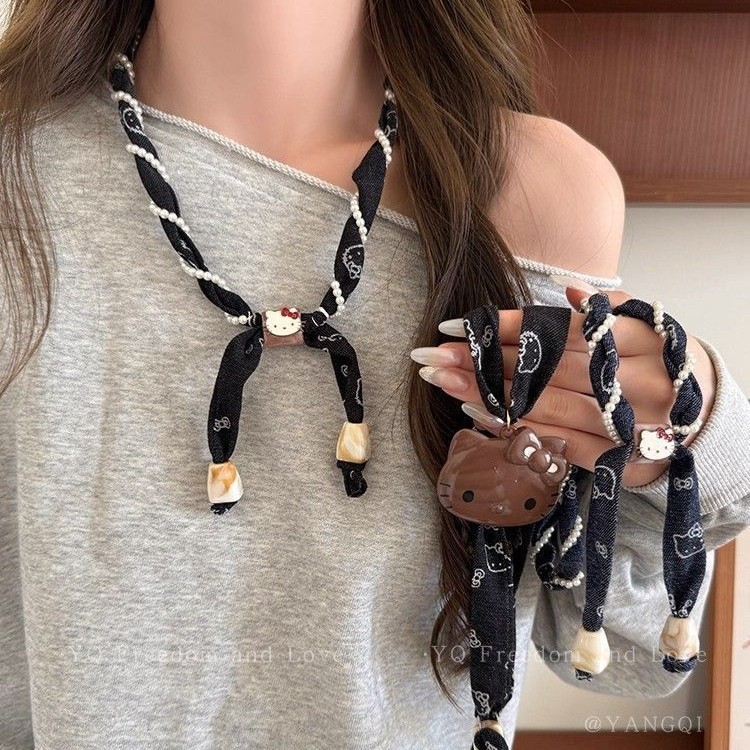 手作kitty!可爱kt猫珍珠丝巾项链女复古独特设计感毛衣链长配饰