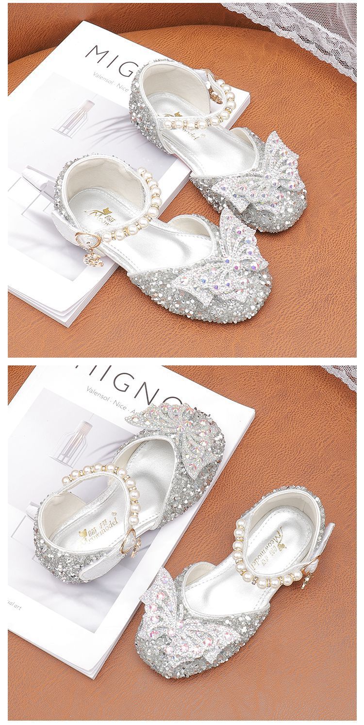 女の子用ハイヒールシューズ エルサ姫 2026春夏 スパンコールクリスタル レザーシューズ シルバー ステージパフォーマンス プリンセスシューズ