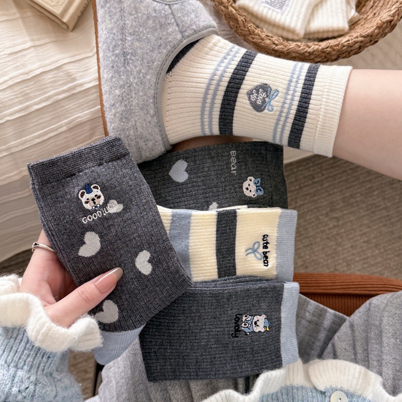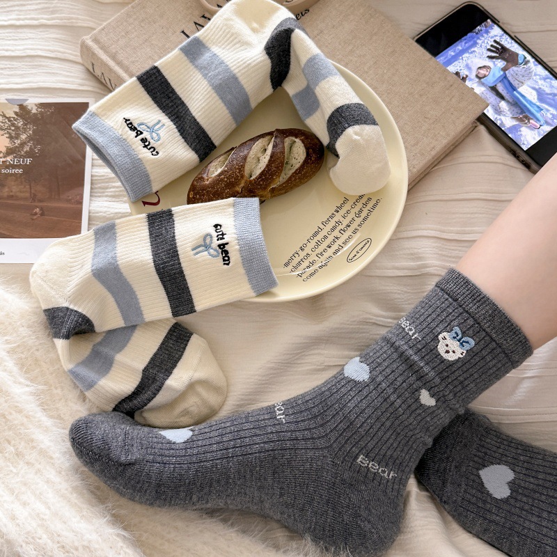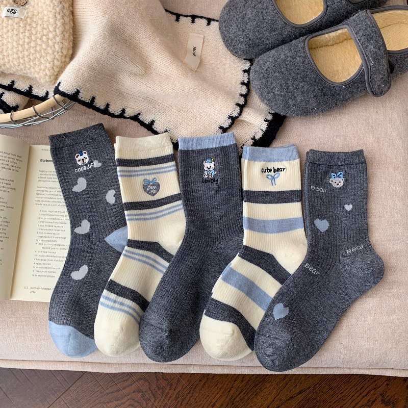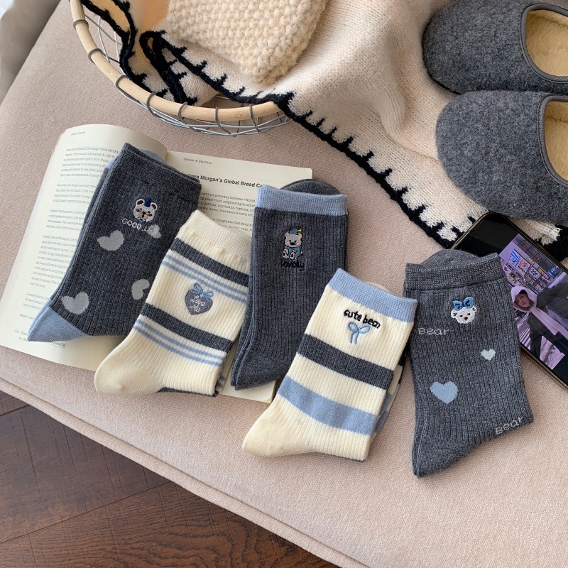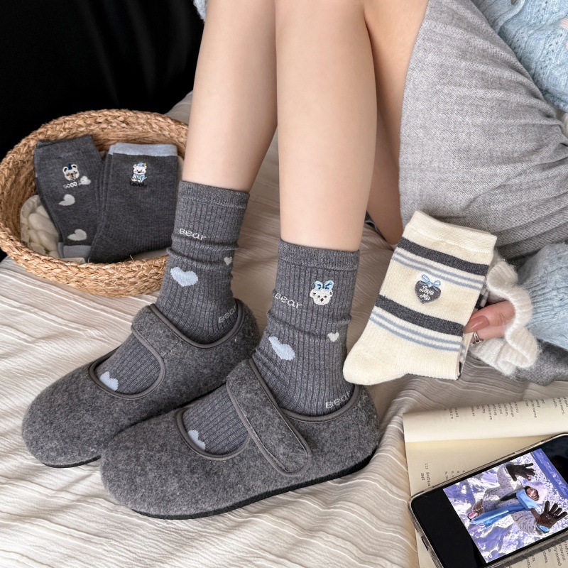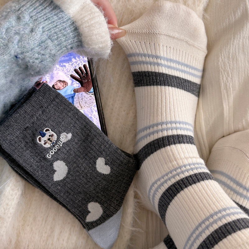 无骨羊毛袜子女灰蓝系中筒袜冬季加厚保暖可爱卡通刺绣条纹堆堆袜