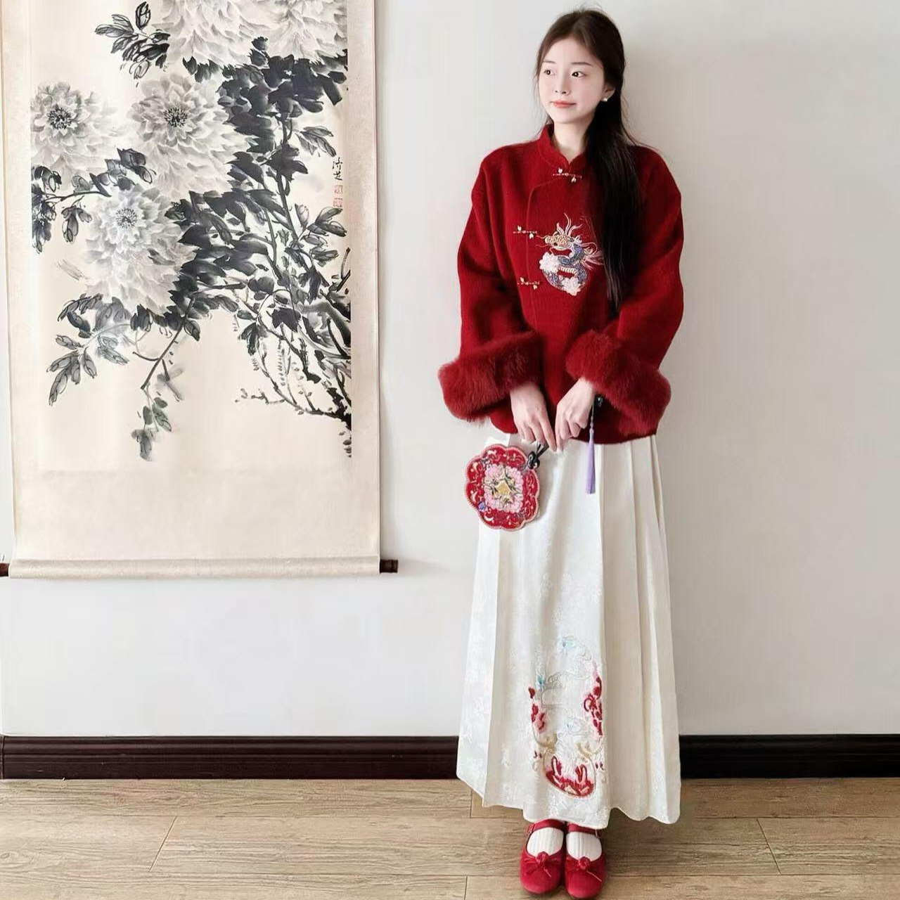 回门新娘便服平时穿红色新中式毛呢绒外套马面裙秋冬订婚领证礼服