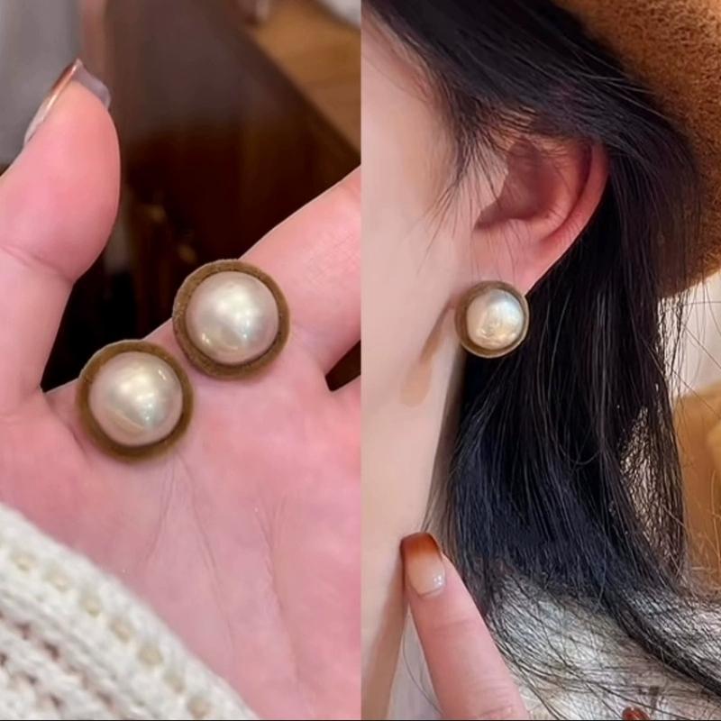 秋冬新款法式复古棕色丝绒珍珠耳钉几何圆形珠珠百搭时尚设计耳环