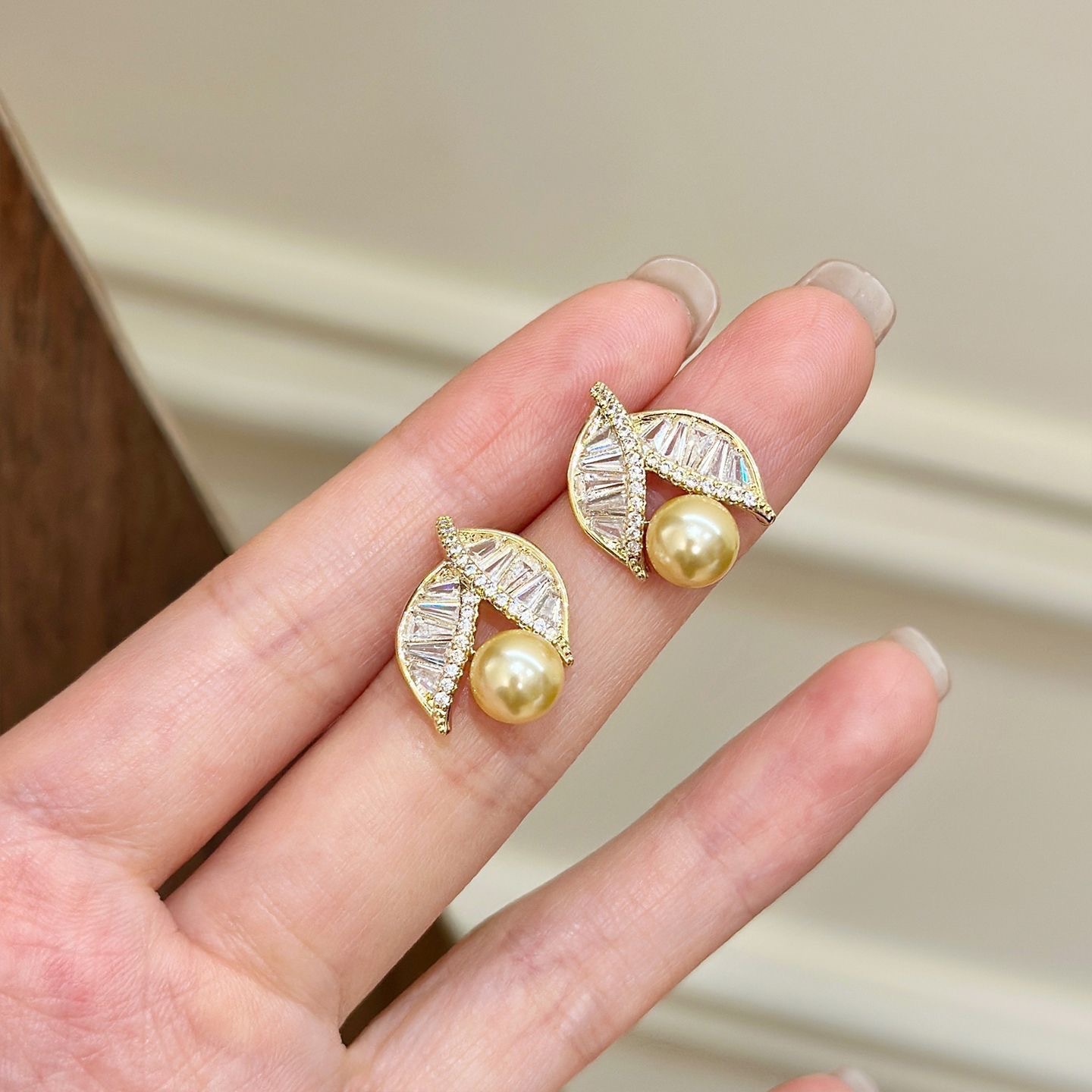韩版时尚秋冬新款金色珍珠锆石树叶耳钉女轻奢耳环耳饰S925银针
