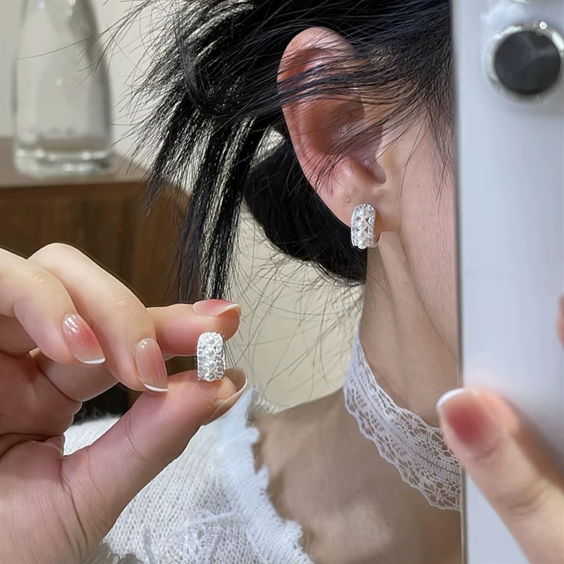 韩系ins简约冷淡风银色错位满锆贝壳镶嵌耳扣精致独特设计感百搭