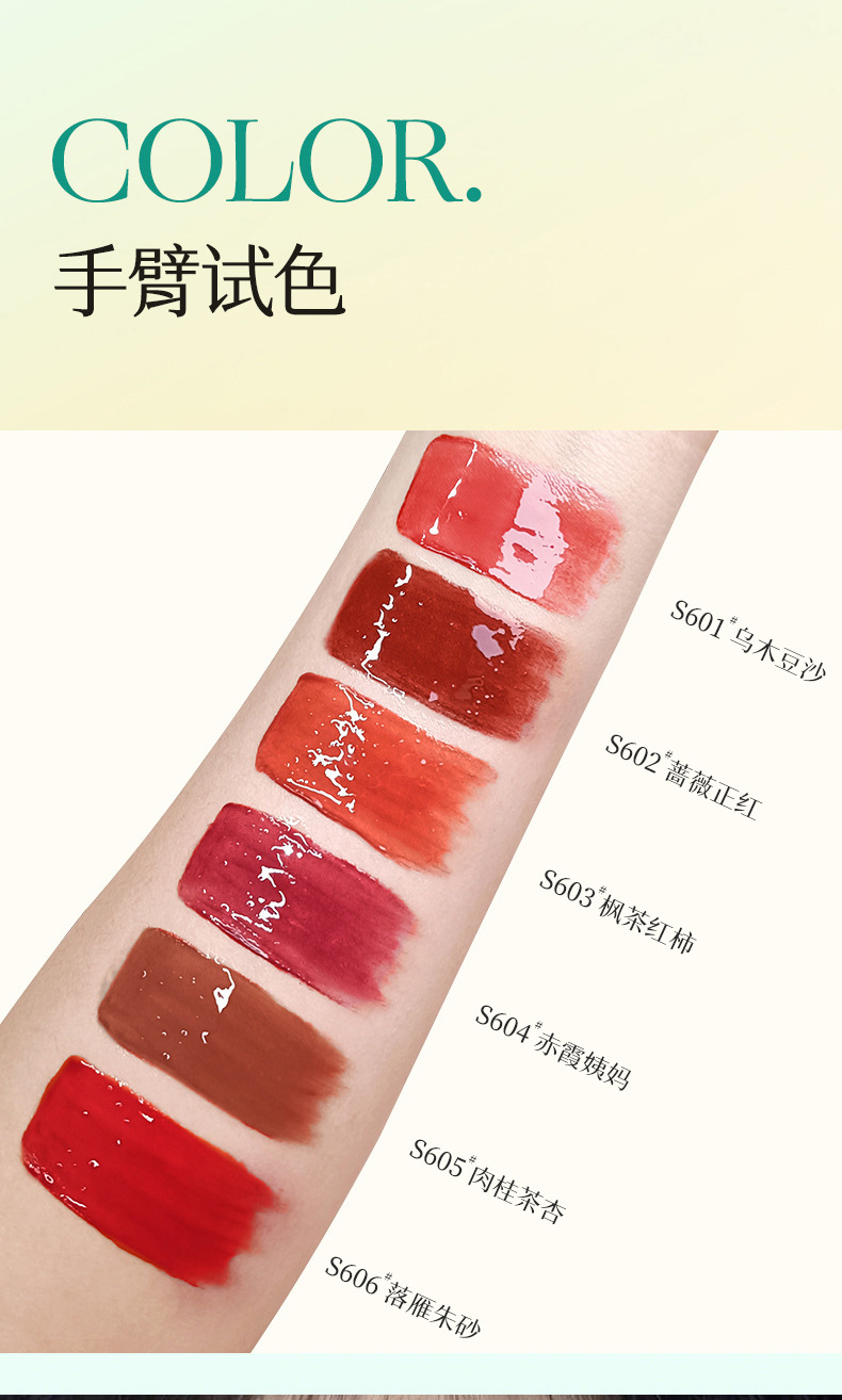 颜色 #S601乌木豆沙,#S604赤霞姨妈,#S602蔷薇正红,#S603枫茶红柿,#S605肉桂茶杏,#S606落雁朱砂