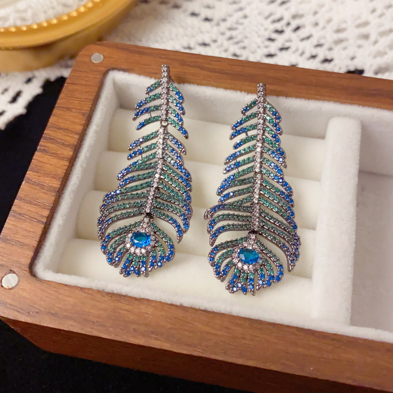 重工奢华锆石孔雀羽毛耳环长款流苏s925银针优雅高级感轻奢耳饰女