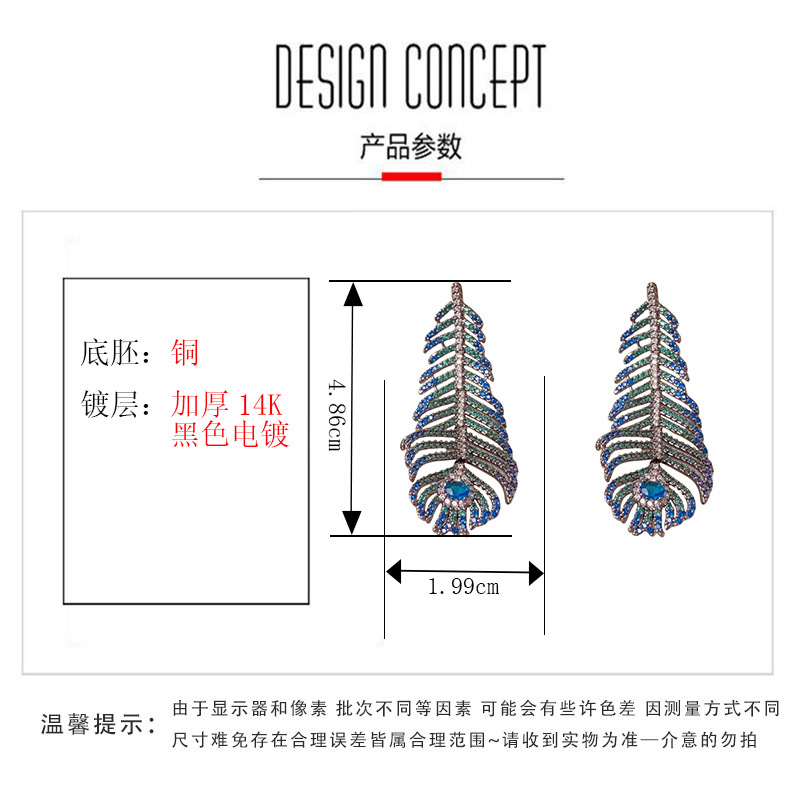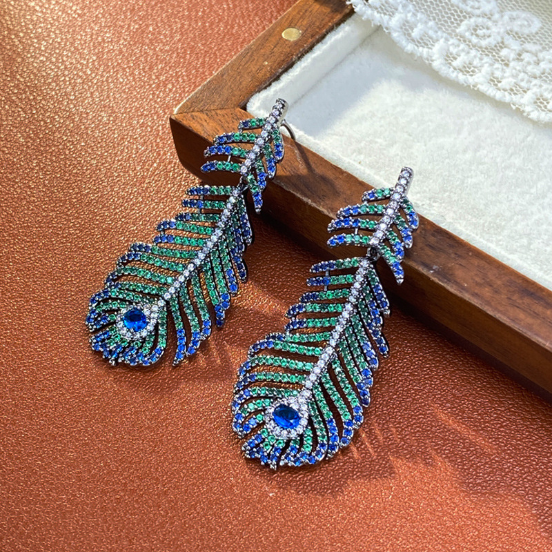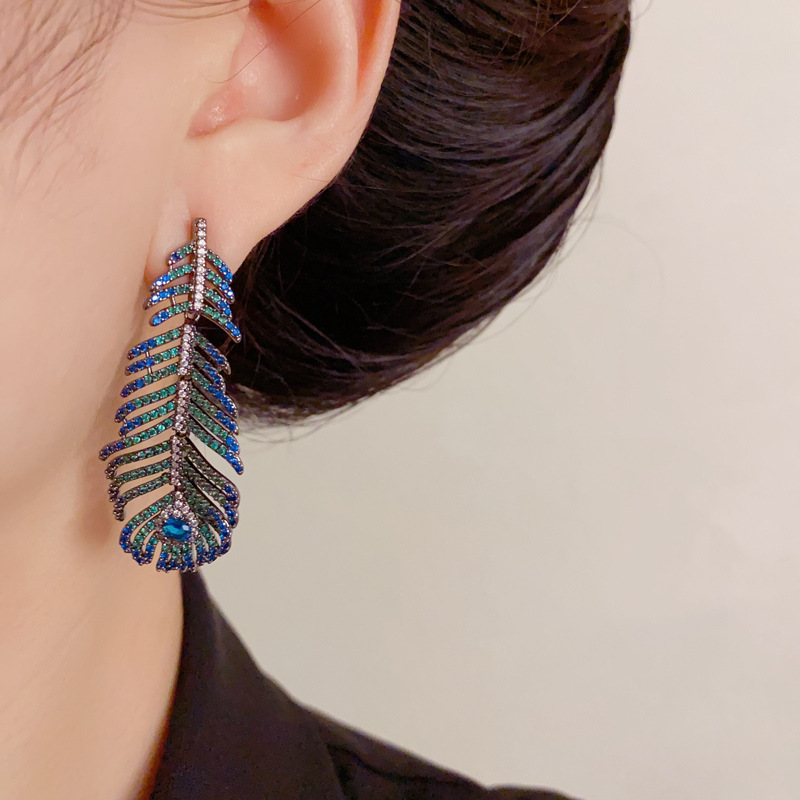 跨境重工轻奢高级感孔雀羽毛耳环长款时尚小众气质满钻几何耳钉女