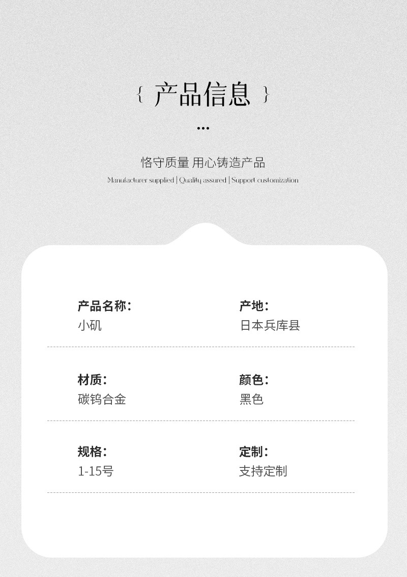规格 1号【11枚】,2号【11枚】,3号【11枚】,4号【11枚】,5号【11枚】,6号【10枚】,7号【10枚】,8号【9枚】,9号【9枚】,10号【8枚】,11号【7枚】,12号【6枚】,13号【5枚】,14号【4枚】