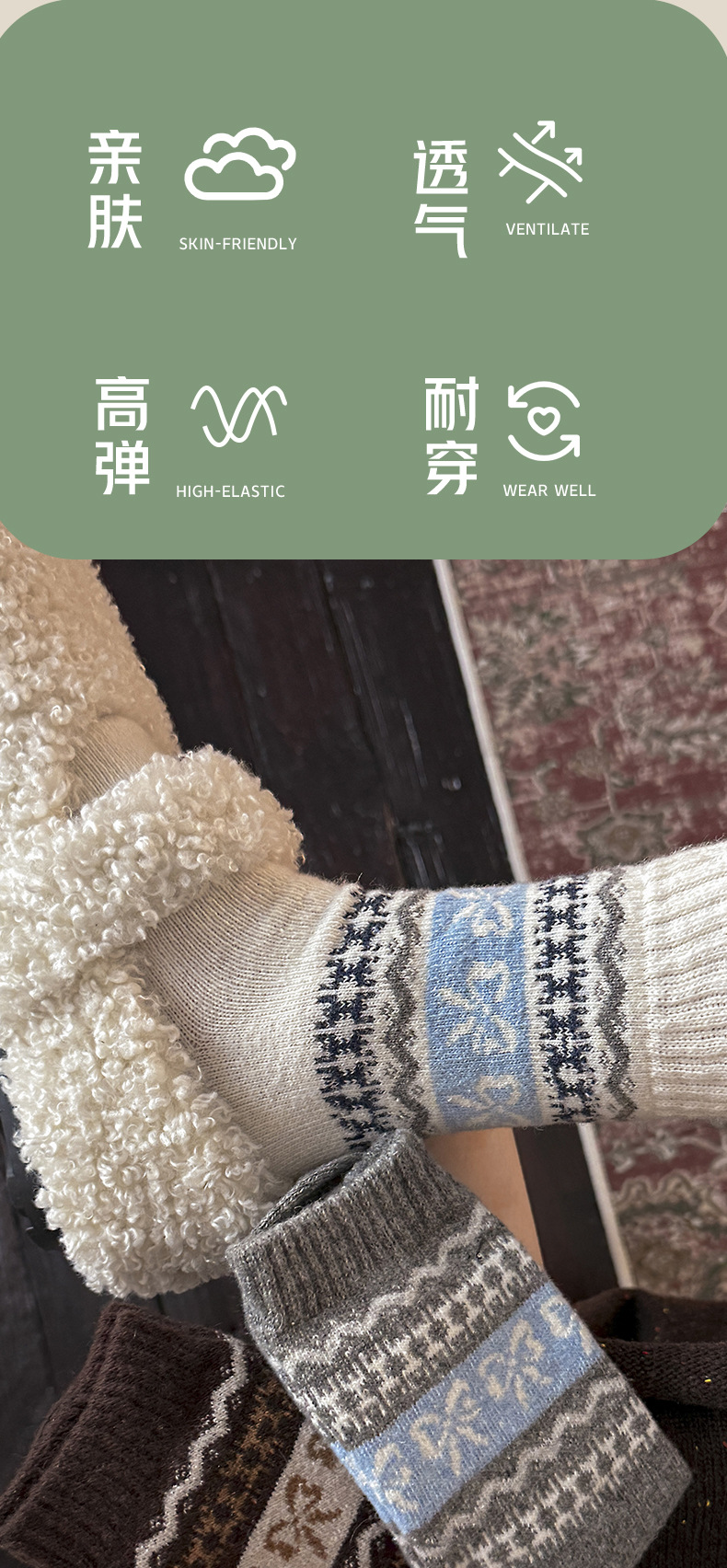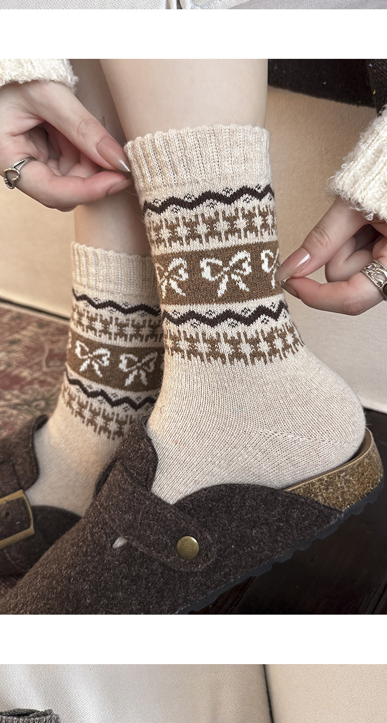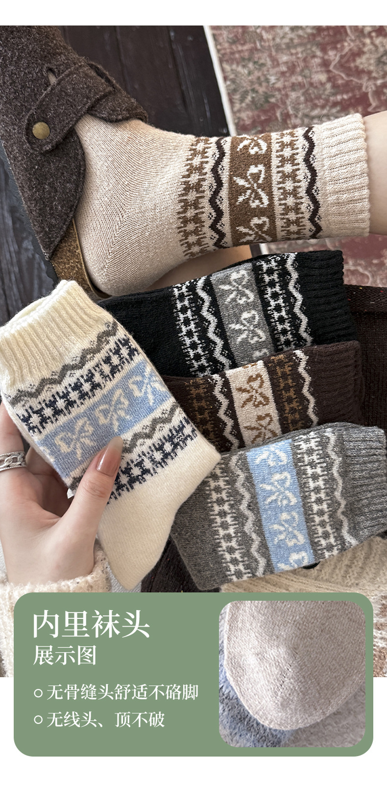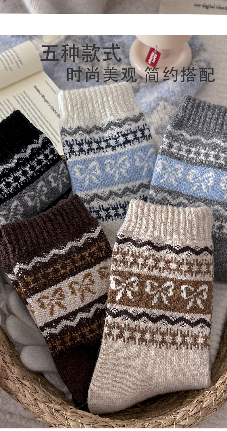 秋冬费尔岛袜子女日系复古加厚保暖羊毛中筒袜美拉德蝴蝶结堆堆袜