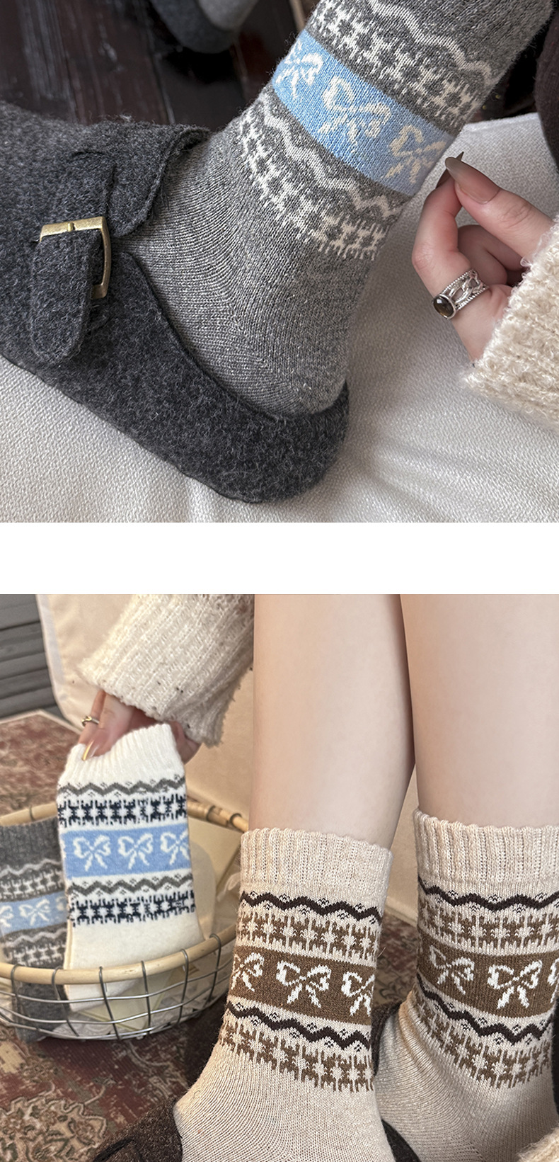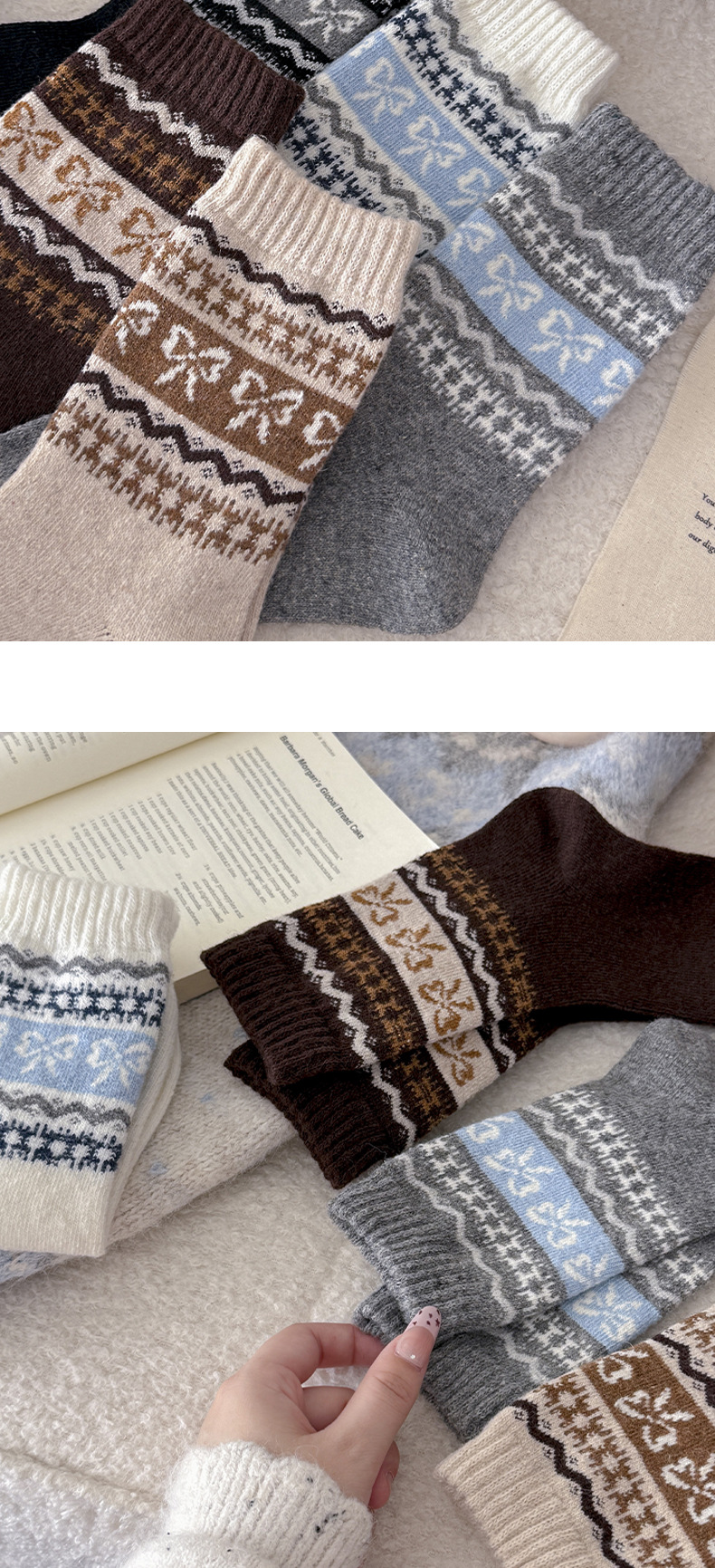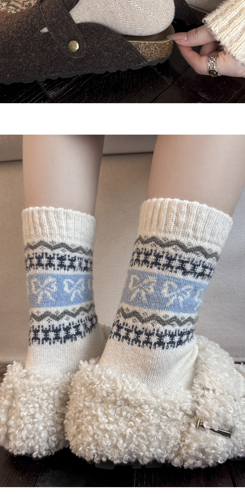 秋冬费尔岛袜子女日系复古加厚保暖羊毛中筒袜美拉德蝴蝶结堆堆袜