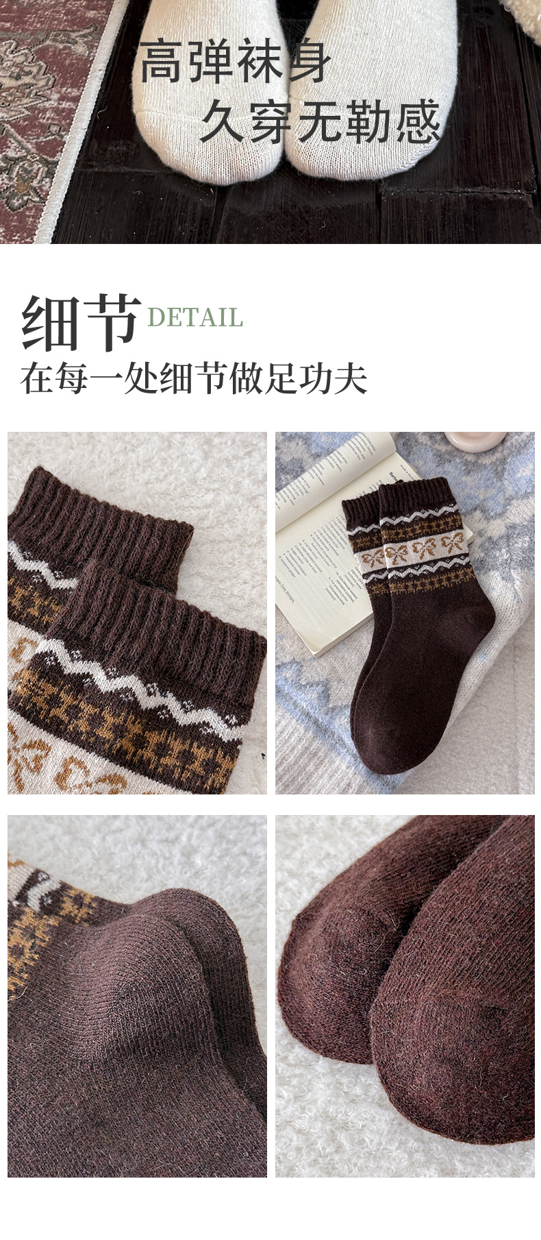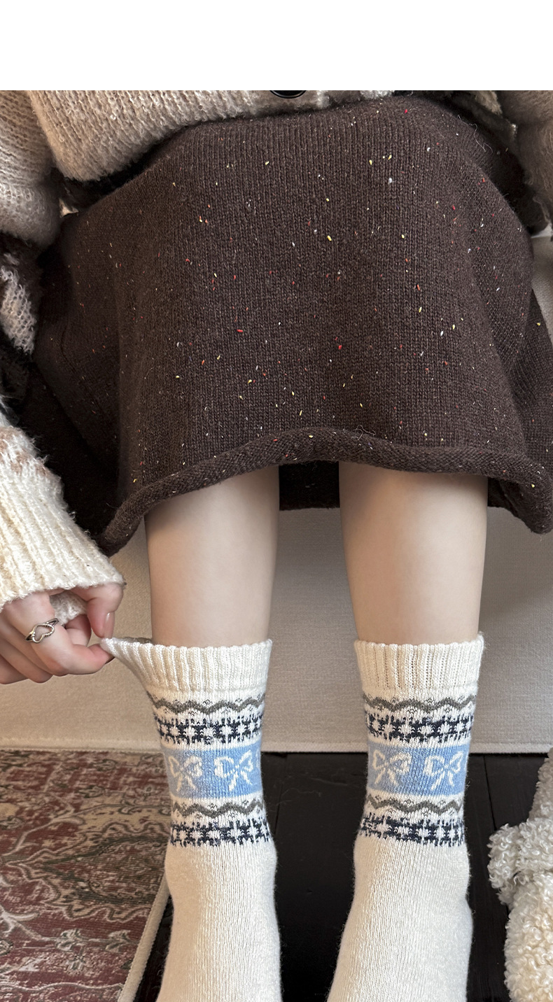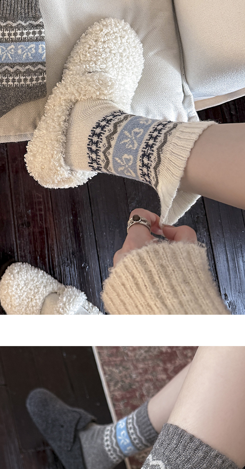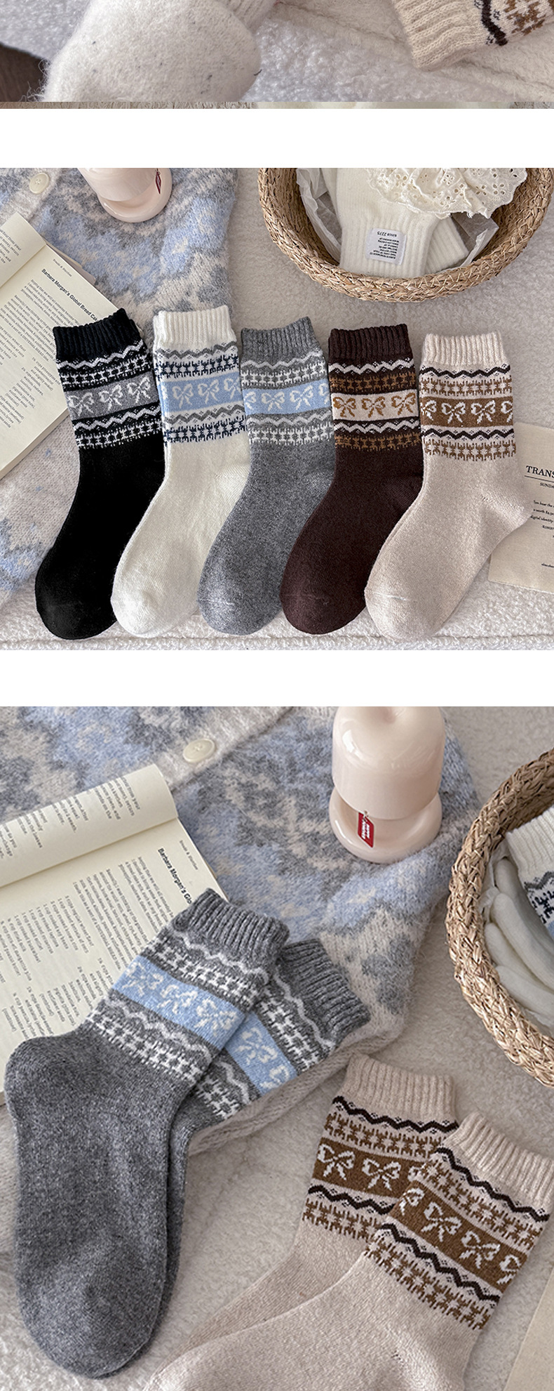 秋冬费尔岛袜子女日系复古加厚保暖羊毛中筒袜美拉德蝴蝶结堆堆袜
