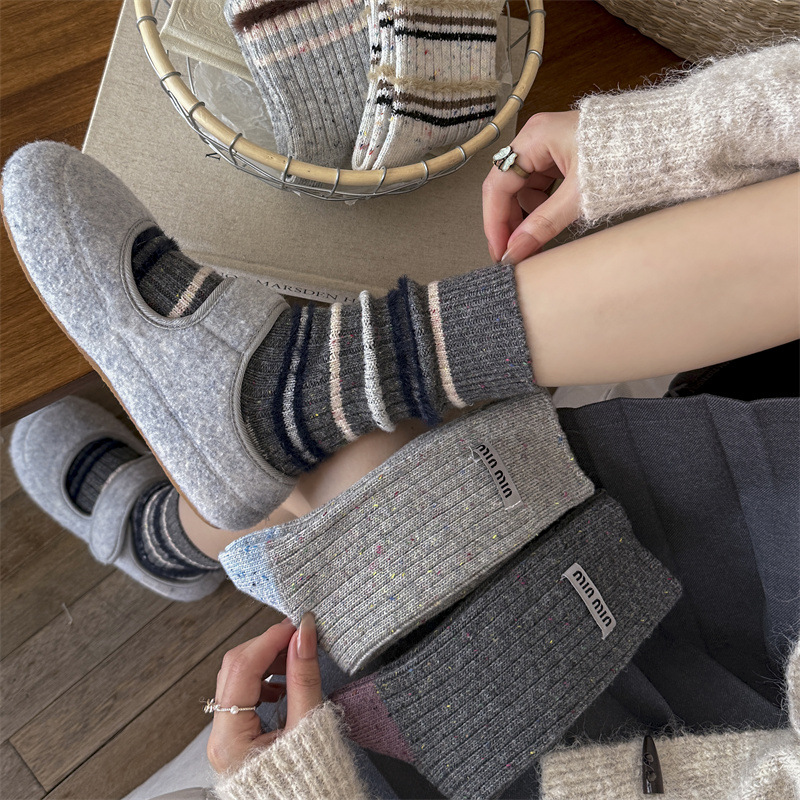 miu系撞色秋冬点子纱貂绒粗针条纹羊毛袜子女加厚保暖布标堆堆袜