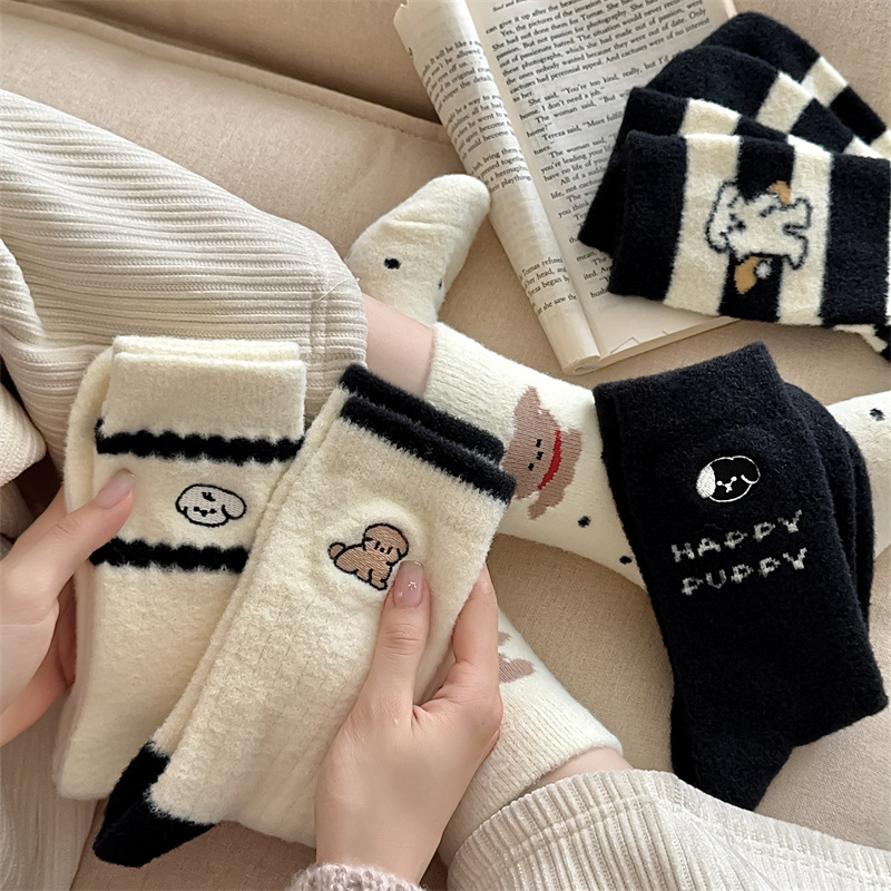 羊绒袜子女秋冬卡通腊肠小狗刺绣波点中筒袜羊毛袜保暖加厚堆堆袜