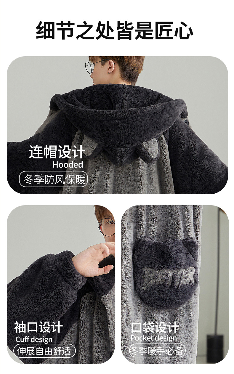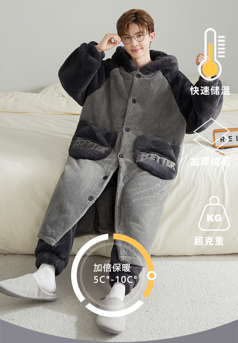 300斤の帽子付き寝衣男は冬にベルベットを厚くして、韓国版の長いコーラルベルベットのジッパーボタン一体型バスローブ