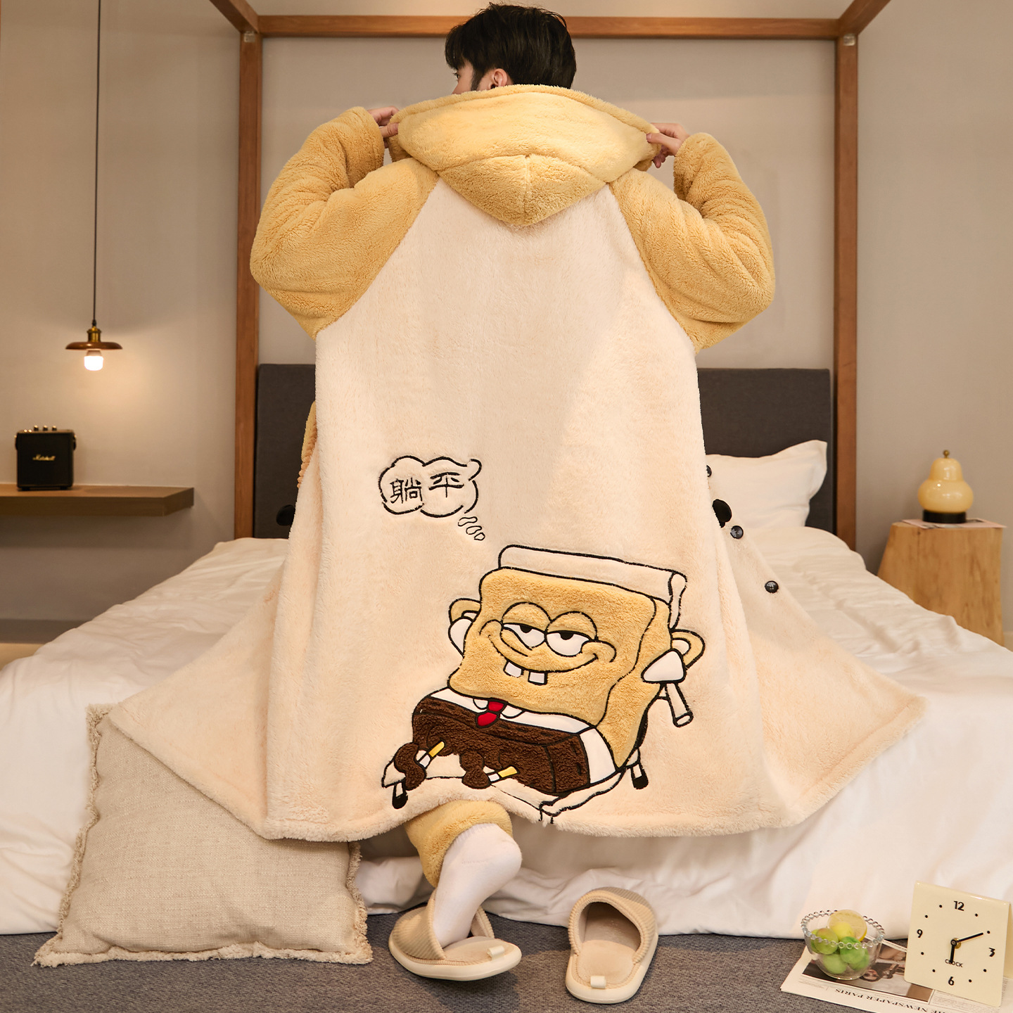 男士睡袍秋冬季加绒加厚青年珊瑚绒卡通海绵宝宝家居服套装可外穿