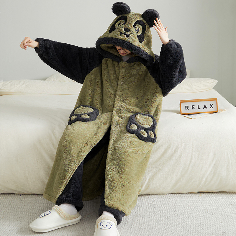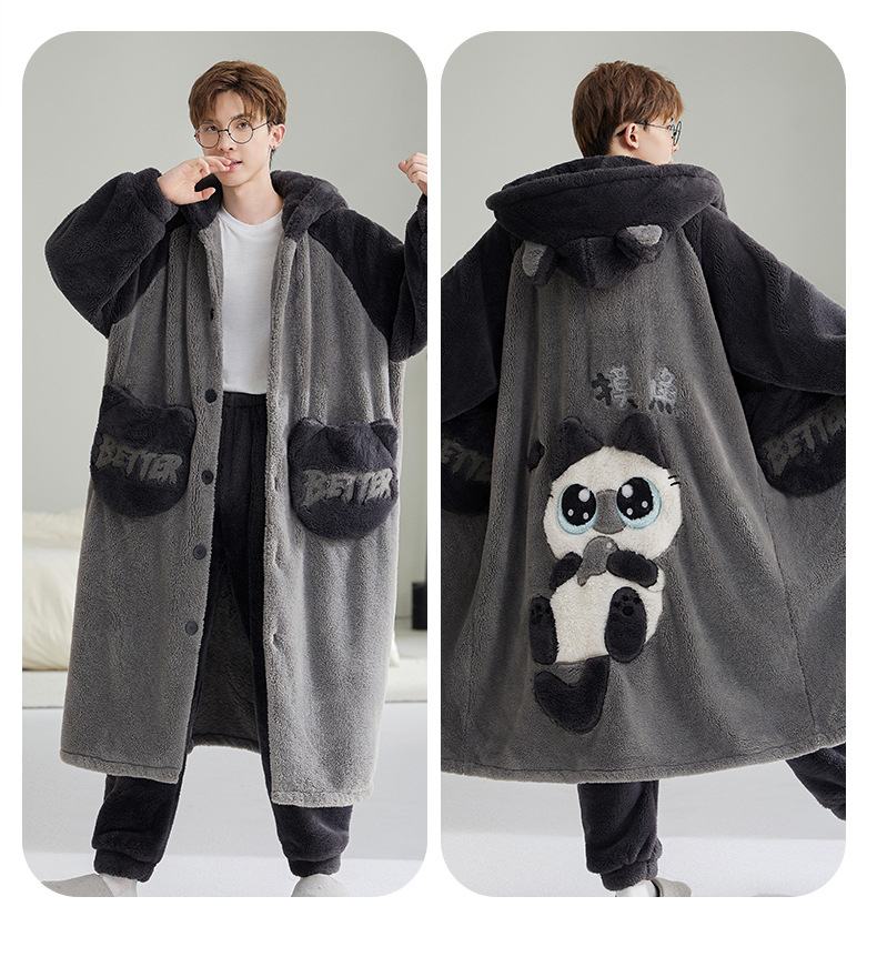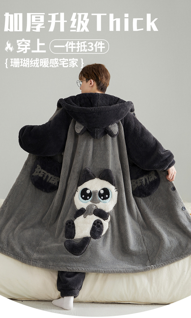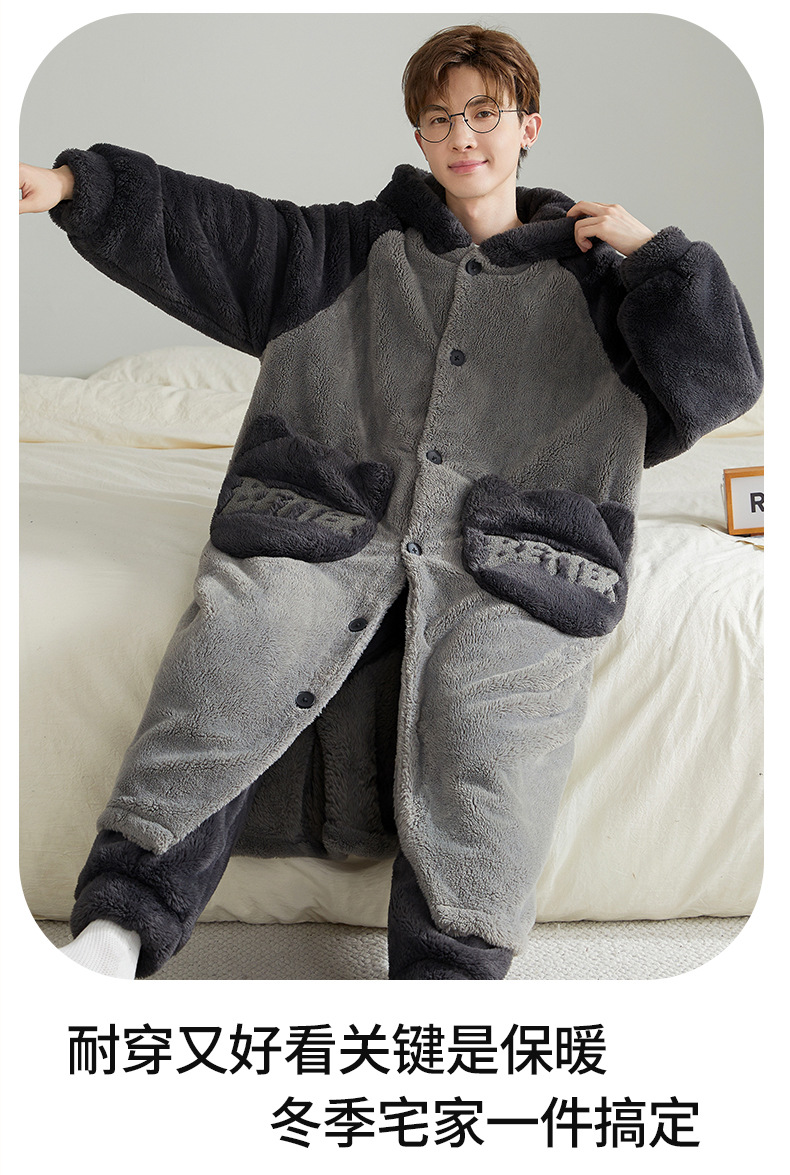 加厚加绒珊瑚绒睡袍男士睡衣秋冬季卡通男款家居服套装连帽可外穿