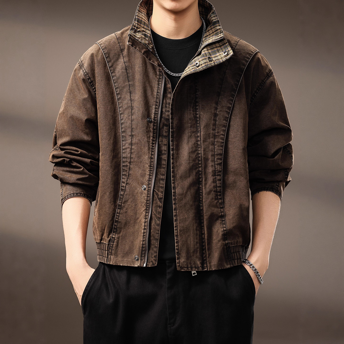 美式复古休闲夹克男士外套2025新款秋冬大码百搭立领重磅潮牌衣服
