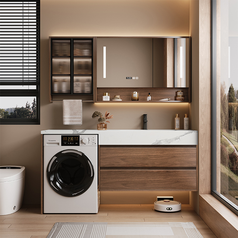 新しい中国風のクルミ材洗濯機一体型キャビネット浴室洗面台洗面台キャビネット組み合わせスマートミラーキャビネット浴室
