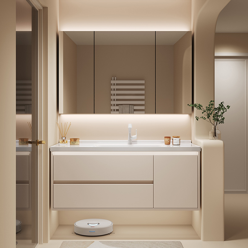クリームスタイルのバスルームキャビネット、洗面台、洗面台キャビネットの組み合わせ、壁掛けセラミック一体型洗面台キャビネット