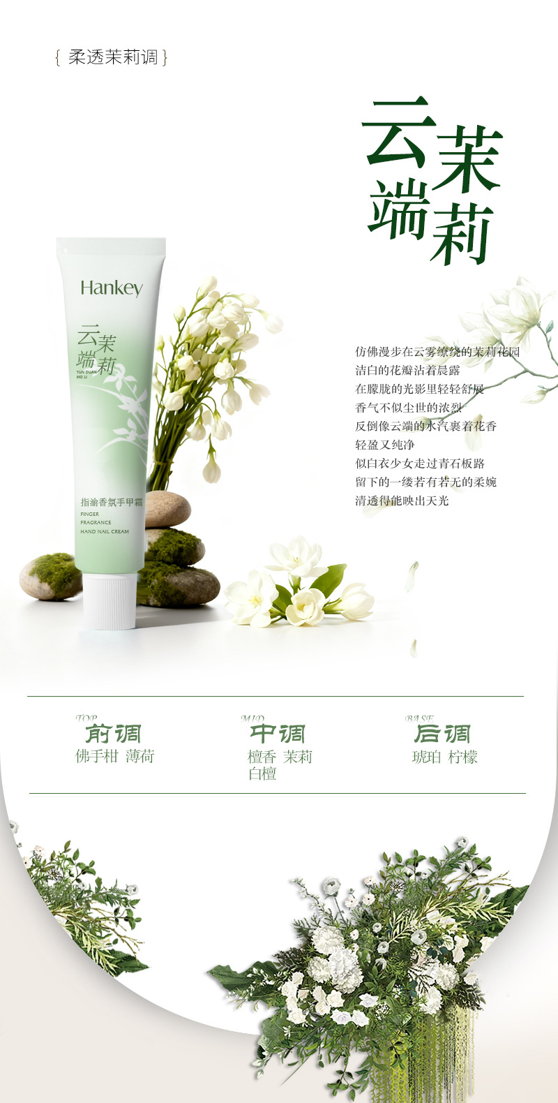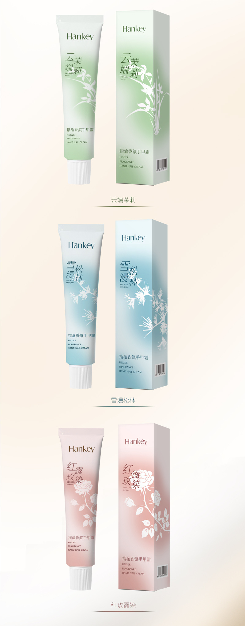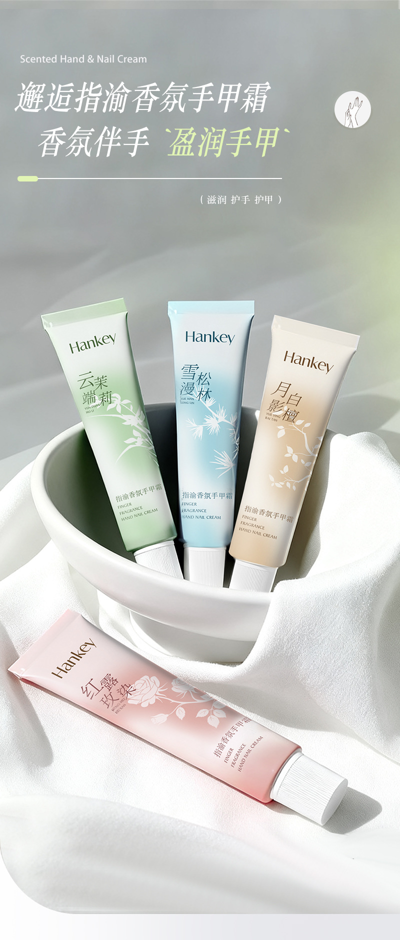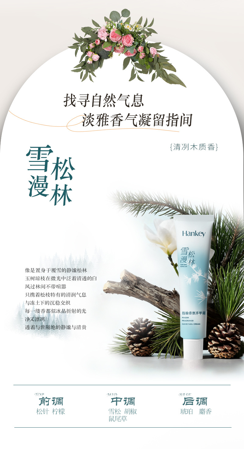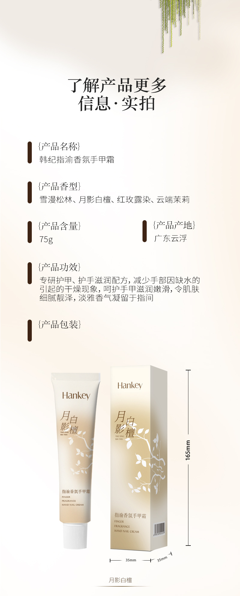 产品规格 手甲霜(月影白檀)75g,手甲霜(雪漫松林)75g,手甲霜(红玫露染)75g,手甲霜(云端茉莉)75g