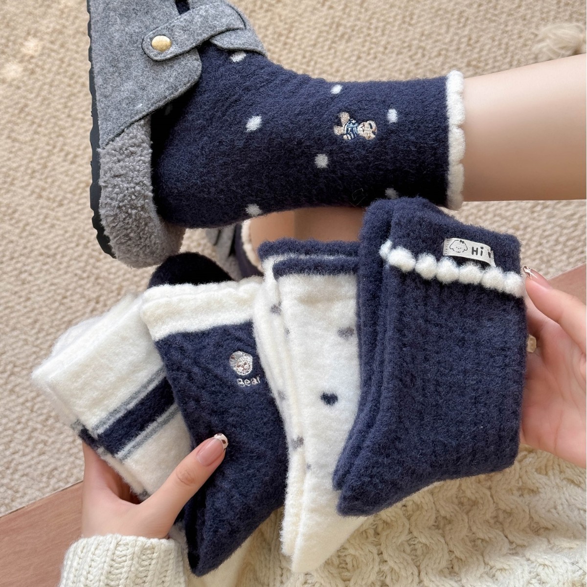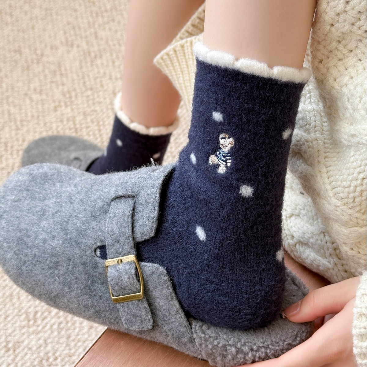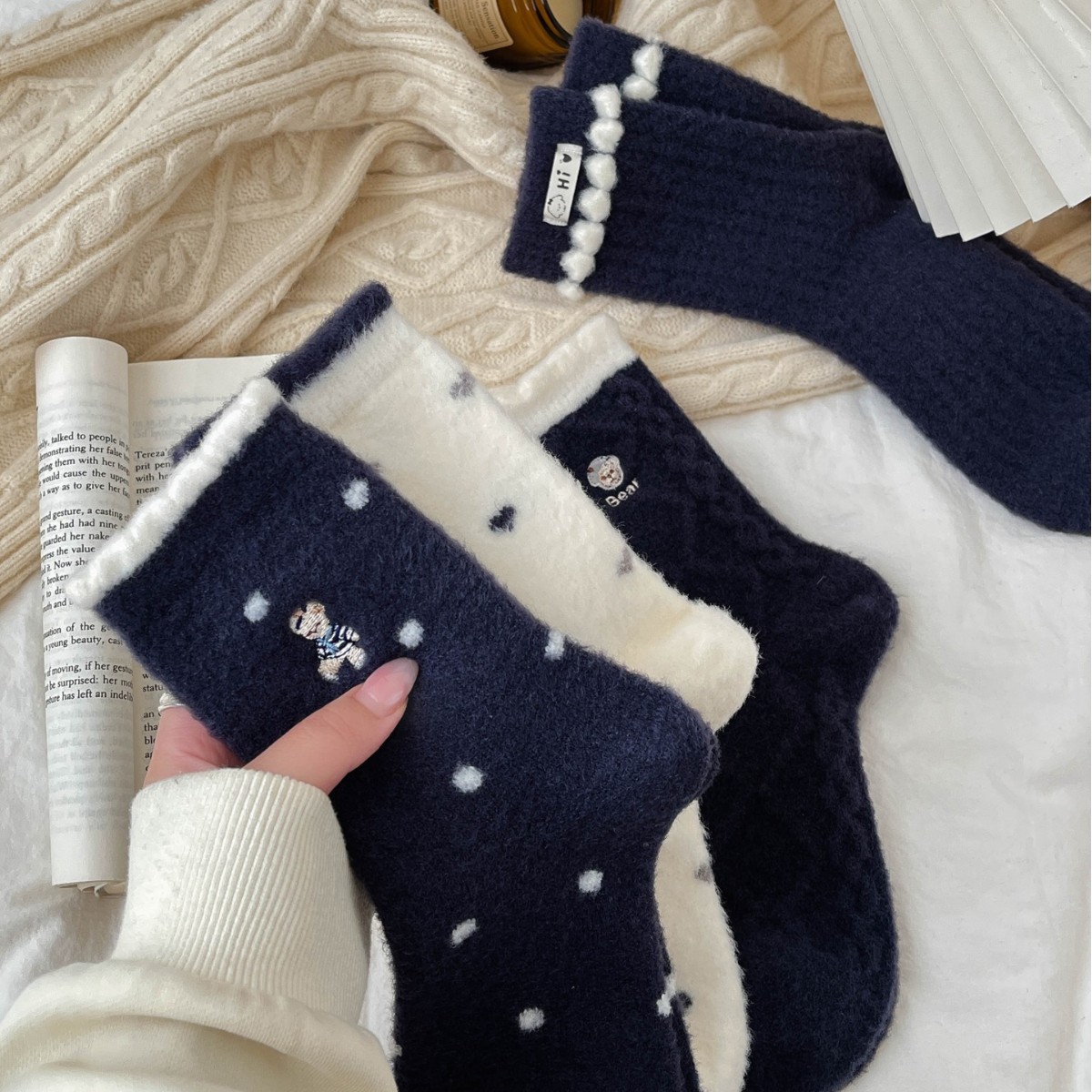 加厚超保暖蓝色澳绒袜子女冬季卡通小熊刺绣蝴蝶结冬天中筒睡眠袜