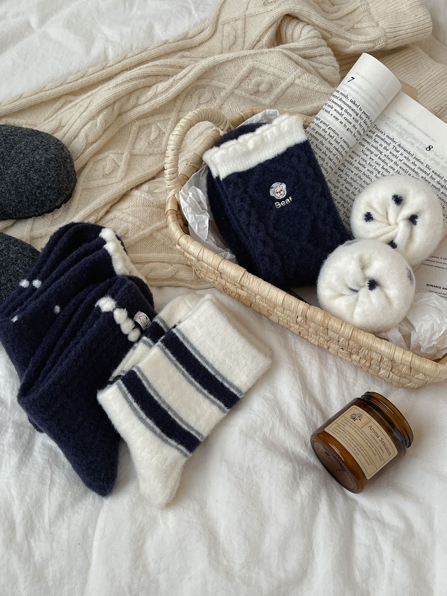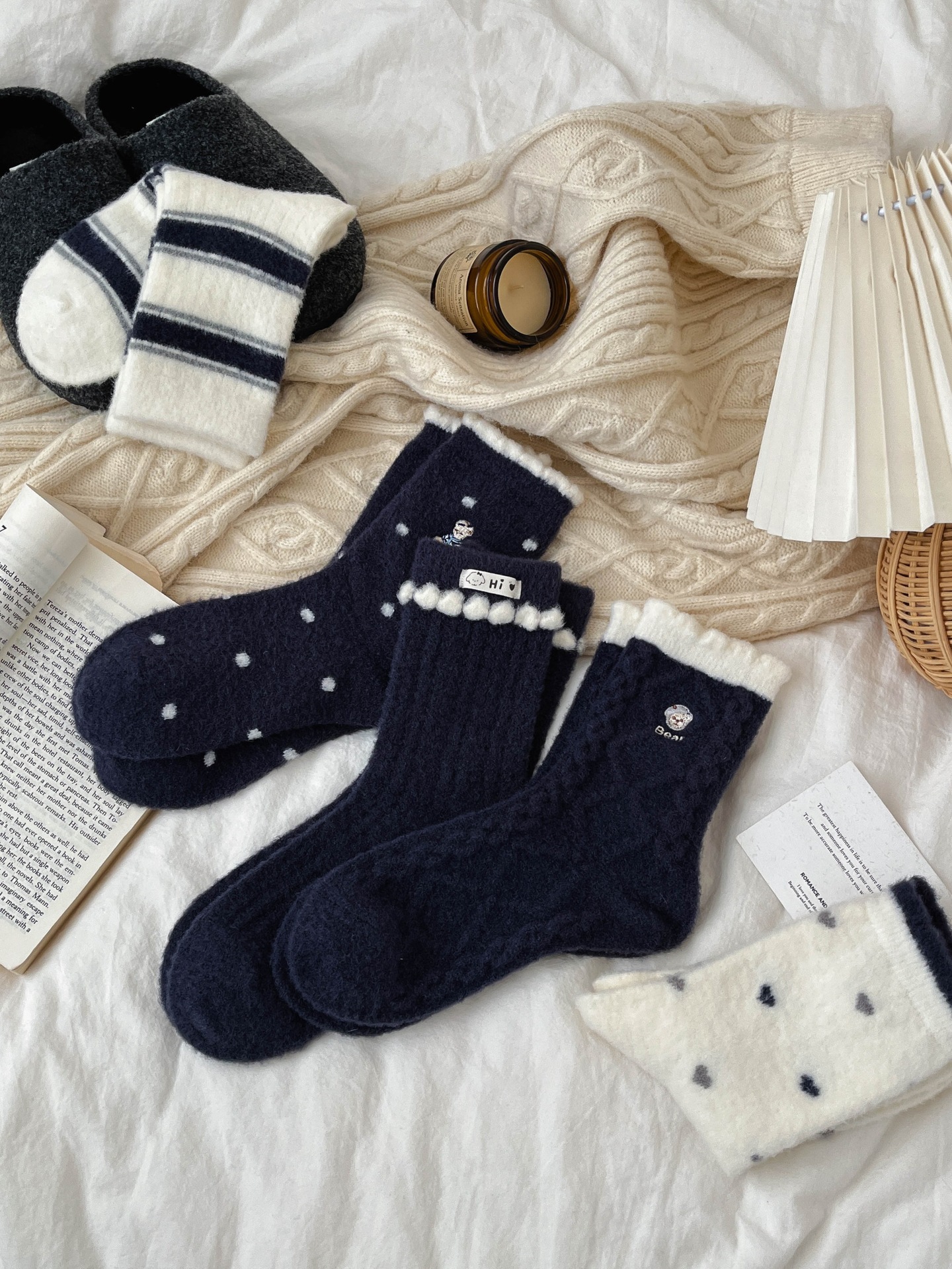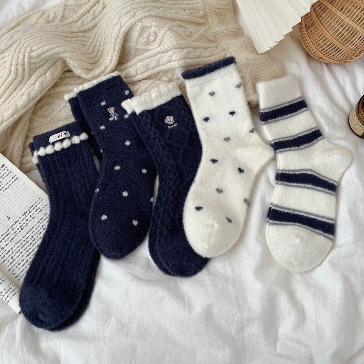 加厚超保暖蓝色澳绒袜子女冬季卡通小熊刺绣蝴蝶结冬天中筒睡眠袜