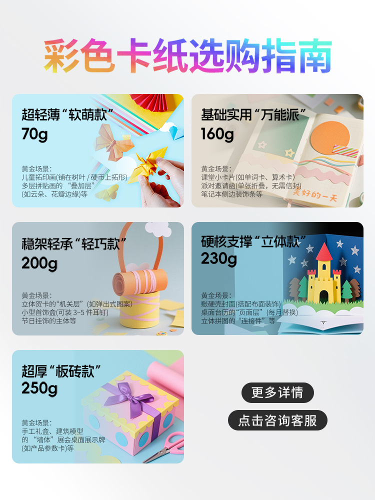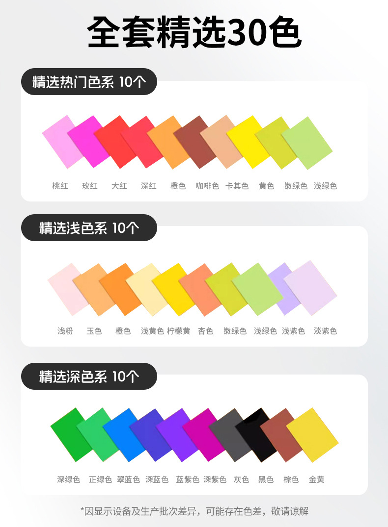 颜色 白色(200g)1张,绿色(200g)1张,柠黄(200g)1张,墨绿(200g)1张,棕色(200g)1张,浅棕(200g)1张,黑色(200g)1张,粉色(200g)1张,浅黄(200g)1张,浅绿(200g)1张,浅蓝(200g)1张,淡紫(200g)1张,灰色(200g)1张,红色(200g)1张,橙色(200g)1张,中黄(200g)1张,玫红(200g)1张,湖蓝(200g)1张,金黄(200g)1张,翠蓝(200g)1张