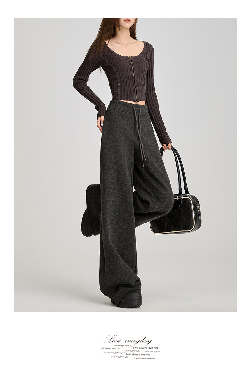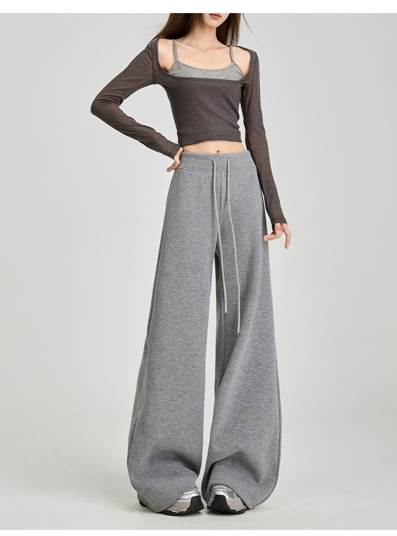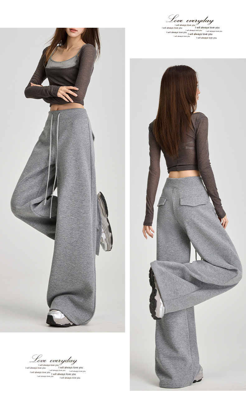 浅灰色阔腿休闲微喇卫裤女秋冬新款美式宽松高腰抽绳直筒运动裤子