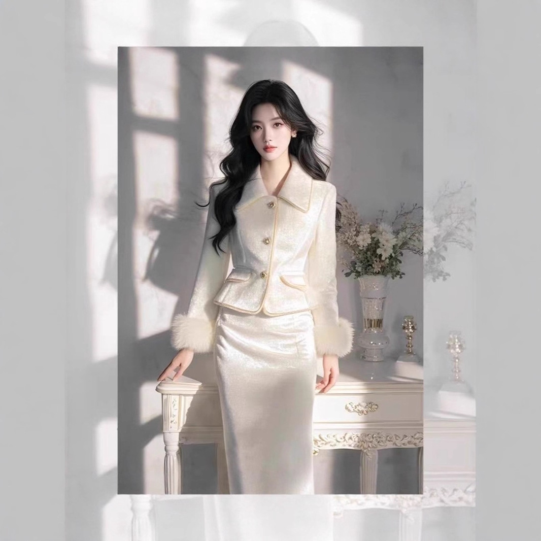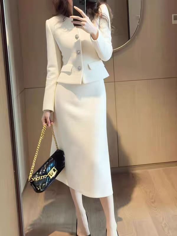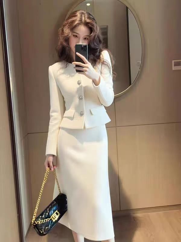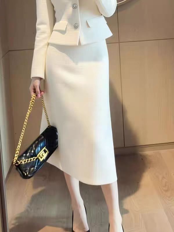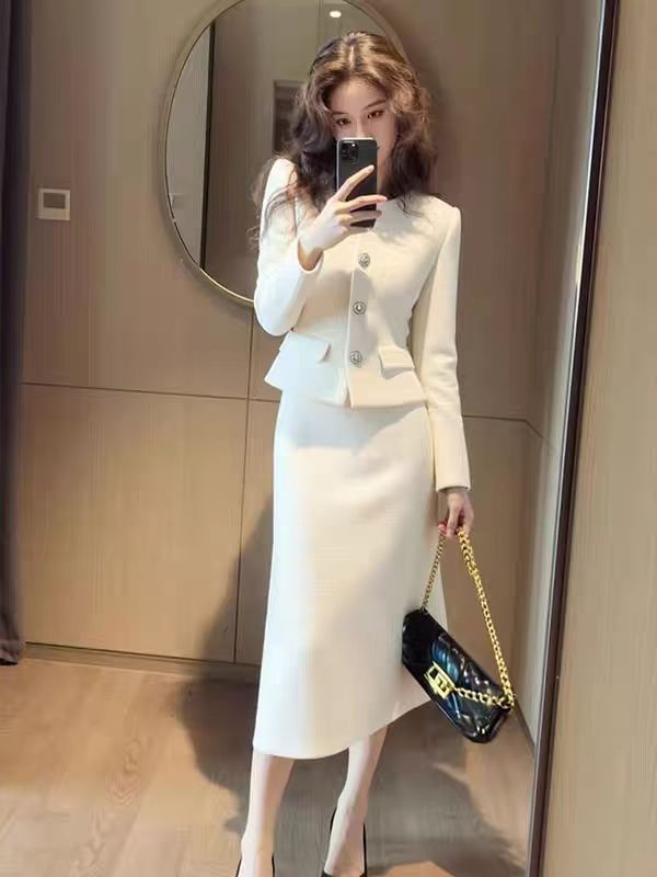 巨好看的秋冬一整套大方得体气质职业小香风白色外套半身裙套装厚