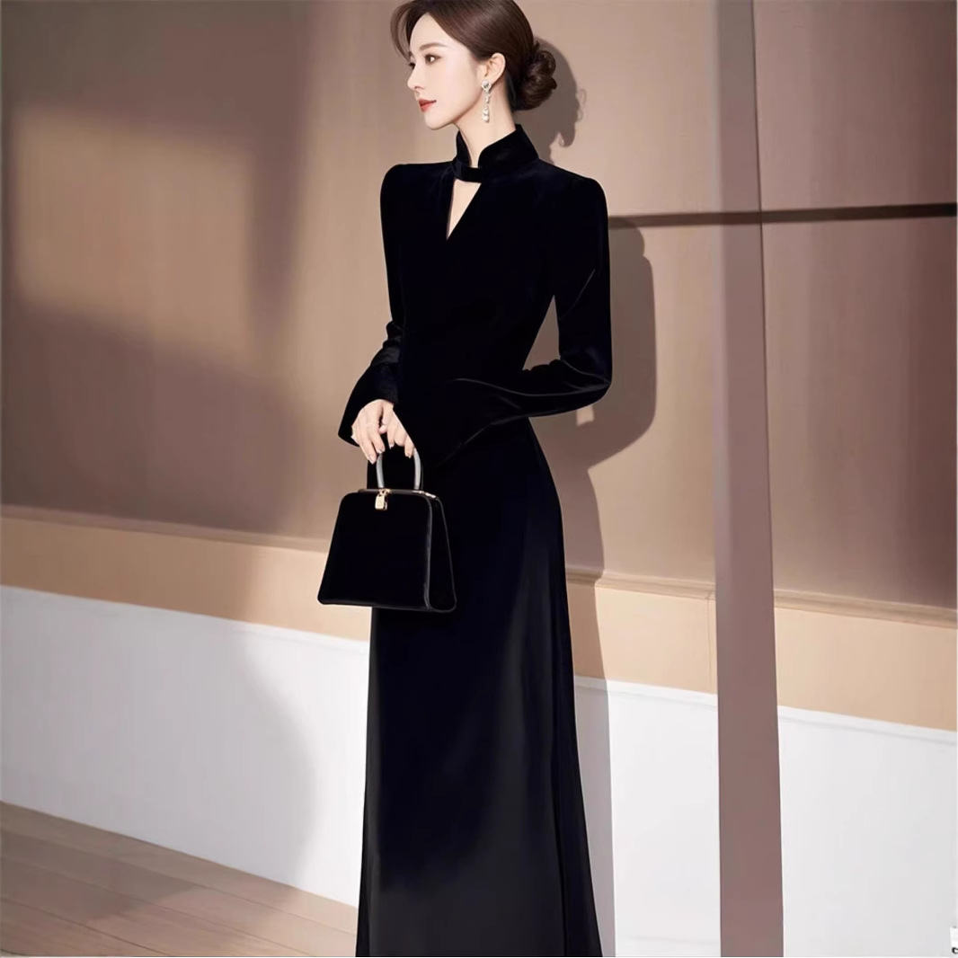冬の新中国式改良チャイナドレスのロングスカートの高級感新中国式国風黒立襟のベルベットのワンピース