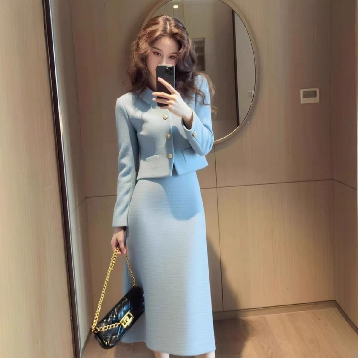 巨好看秋冬装一整套大方得体气质名媛小香风蓝色外套半身裙套装女