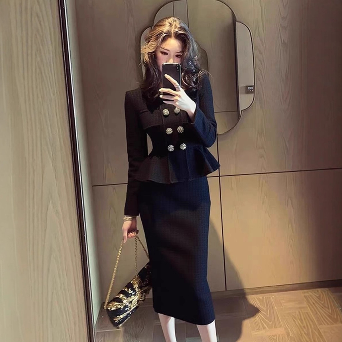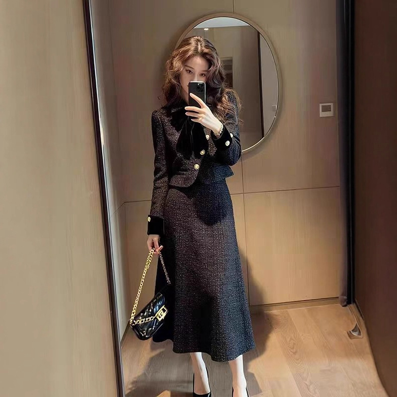 黑色小香风套装女2025秋冬新款法式通勤穿搭西装外套半身裙两件套