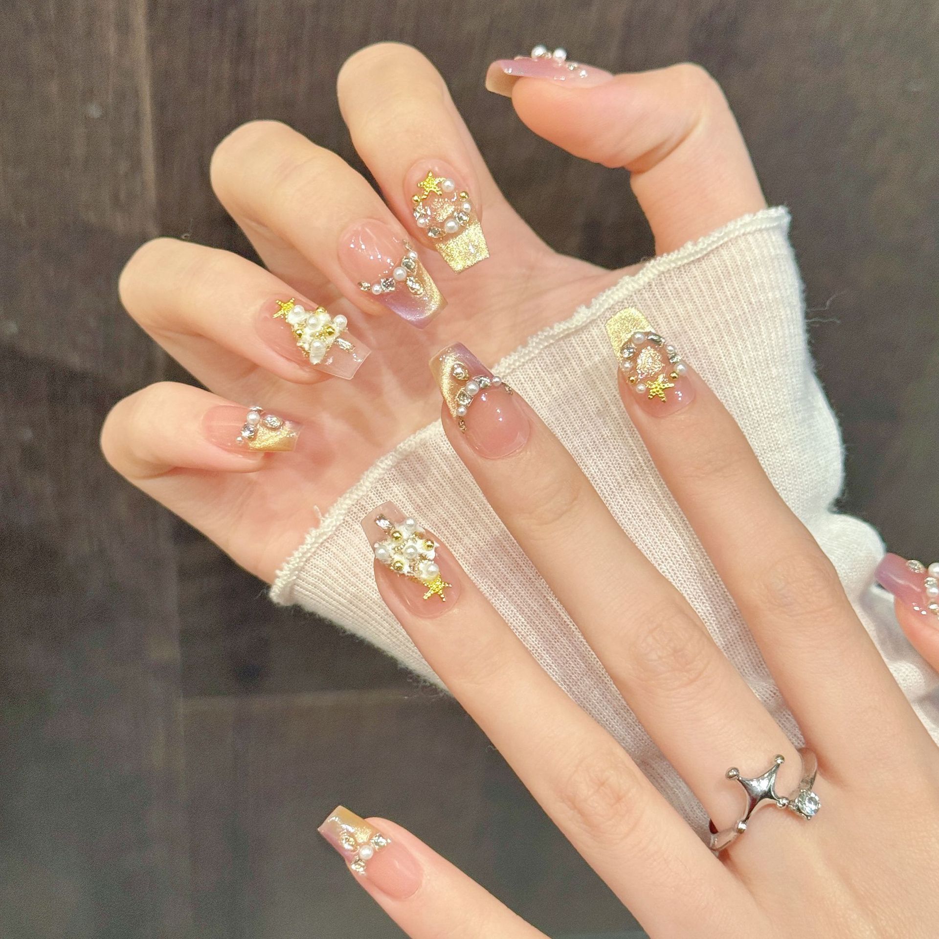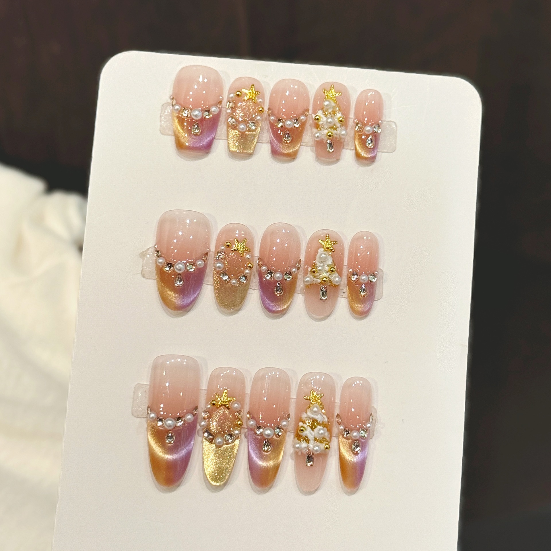 艺禾原创【星愿圣诞】粉调渐变美甲缀珍珠钻金星星手工穿戴甲批发