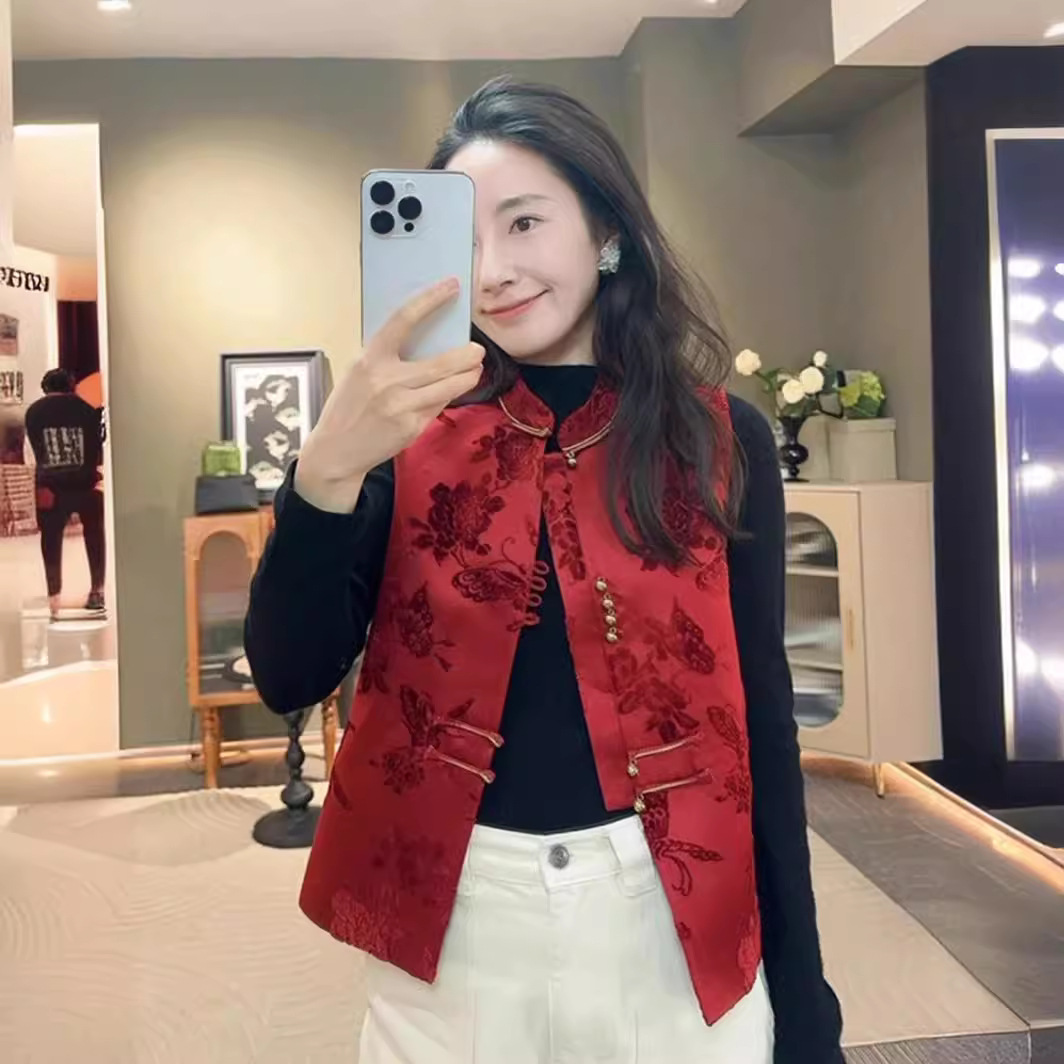 2025春秋新中国式国風高級感超美しい揚げ街洋気新年赤いプリント馬甲百合金