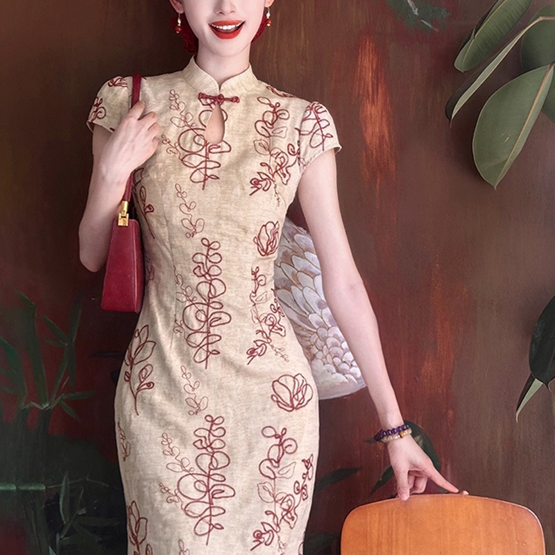 [半生の夢] 新しい中国風の刺繍改良されたチャイナドレス女性の夏の中空ドレスレトロなミドル丈