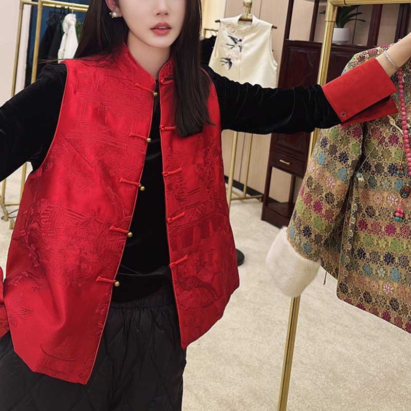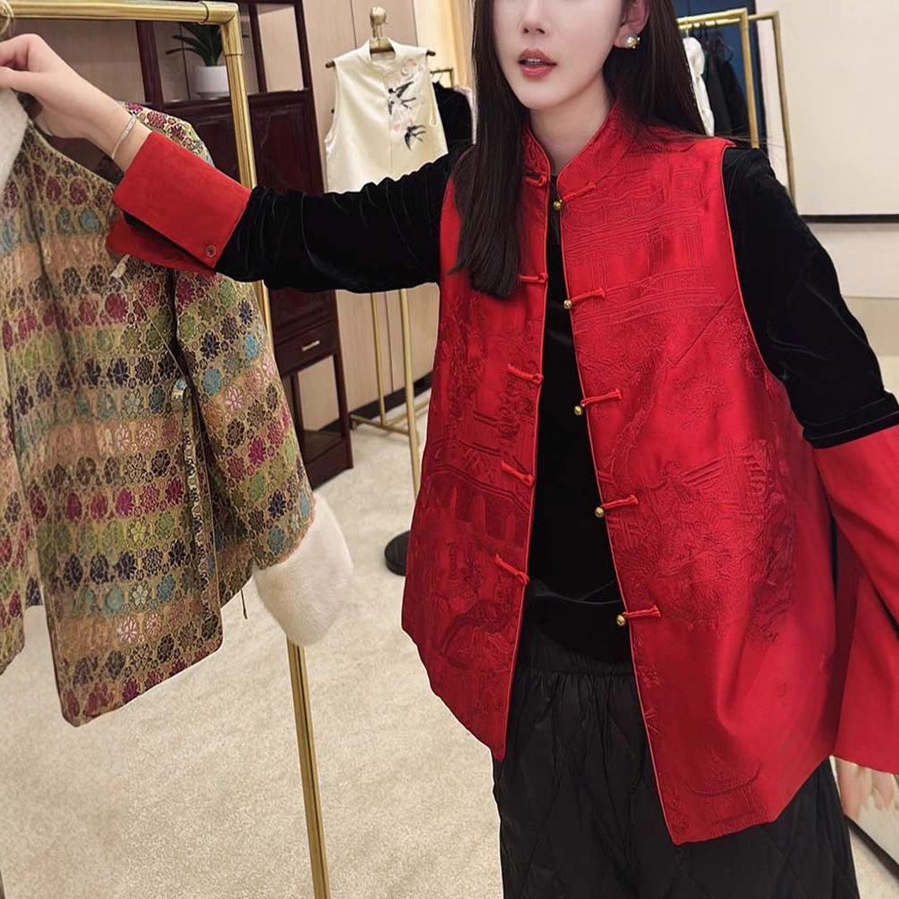 亭台楼阁刺绣新中式国风本命年新年红色盘扣马甲上衣女2025秋季款