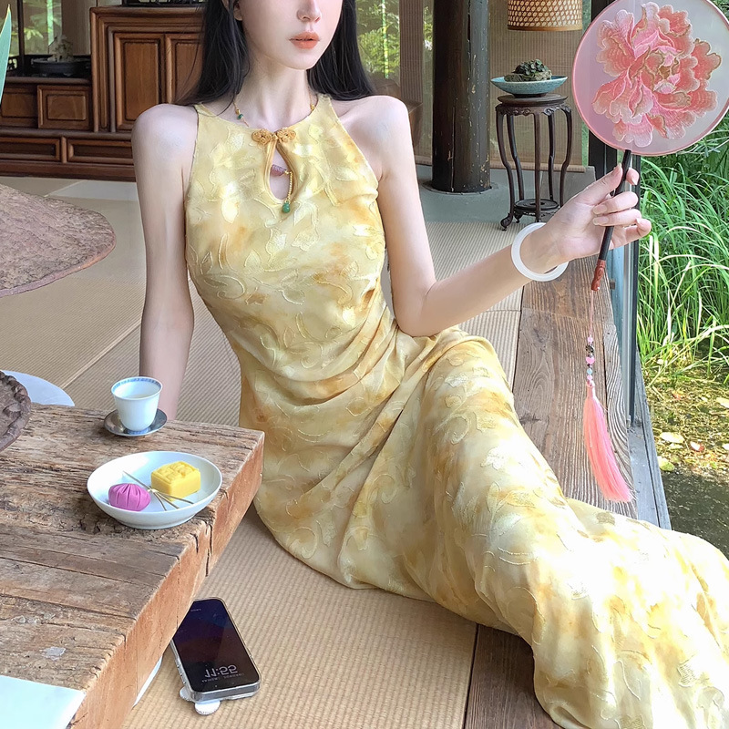 [春志唐信] 民族風の新しい中国風の花柄ショルダーカット改良チャイナドレスミドル丈ドレス気質優しい婦人服
