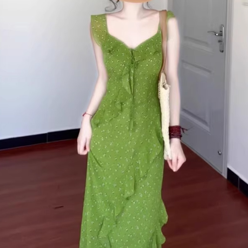 緑のストラップの花のワンピースの子供の夏2025年の海辺の休暇の夏の絶景の砂浜の露背の長いスカート
